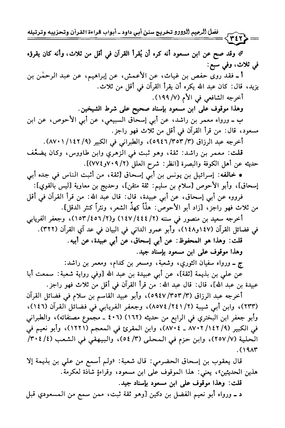 * وقد صح عن ابن مسعود أنه كره أن يُقرأ القرآن في أقل من ثلاث، وأنه كان يقرؤه في ثلاث، وفي سبع: