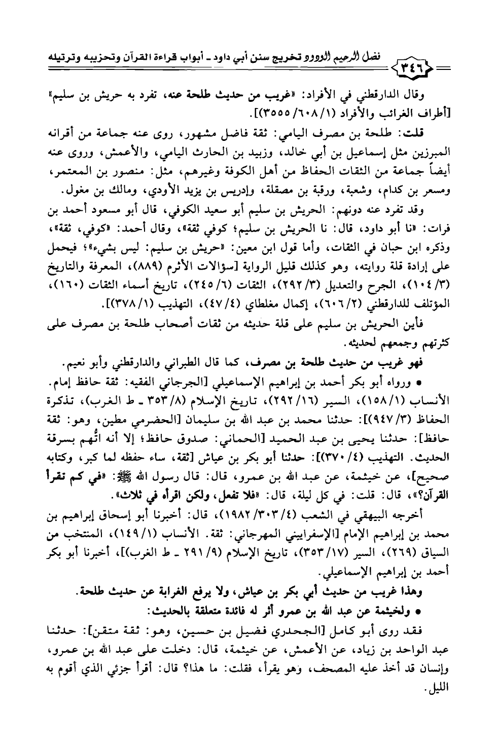 الأنساب (١/ ١٥٨)، السير (١٦/ ٢٩٢)، تاريخ الإسلام (٨/ ٣٥٣ - ط الغرب)، تذكرة الحفاظ (٣/ ٩٤٧)]: حدثنا محمد بن عبد الله بن سليمان الحضرمي مطين، وهو: ثقة حافظ]: حدثنا يحيى بن عبد الحميد الحماني: صدوق حافظ؛ إلا أنه اتُّهم بسرقة الحديث. التهذيب (٤/ ٣٧٠)]: حدثنا أبو بكر بن عياش [ثقة، ساء حفظه لما كبر، وكتابه صحيح]، عن خيثمة، عن عبد الله بن عمرو، قال: قال رسول الله - صلى الله عليه وسلم -: "في كم تقرأ القرآن؟ "، قال: قلت: في كل ليلة، قال: "فلا تفعل، ولكن اقرأه في ثلاث".