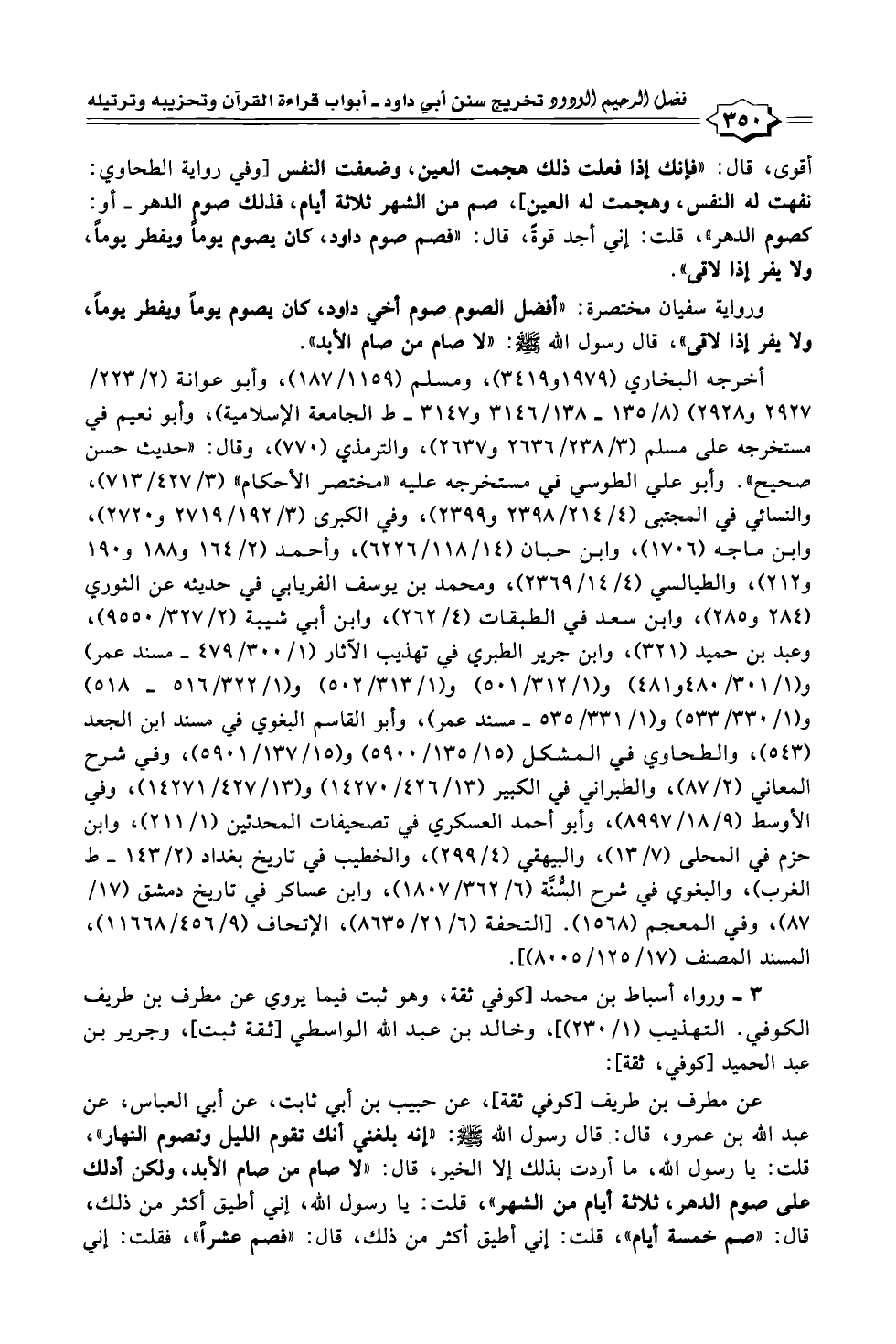 عن مطرف بن طريف [كوفي ثقة]، عن حبيب بن أبي ثابت، عن أبي العباس، عن عبد الله بن عمرو، قال:- قال رسول الله - صلى الله عليه وسلم -: "إنه بلغني أنك تقوم الليل وتصوم النهار"، قلت: يا رسول الله، ما أردت بذلك إلا الخير، قال: "لا صام من صام الأبد، ولكن أدلك على صوم الدهر، ثلاثة أيام من الشهر"، قلت: يا رسول الله، إني أطيق أكثر من ذلك، قال: "صم خمسة أيام"، قلت: إني أطيق أكثر من ذلك، قال: "فصم عشرًا"، فقلت: إني