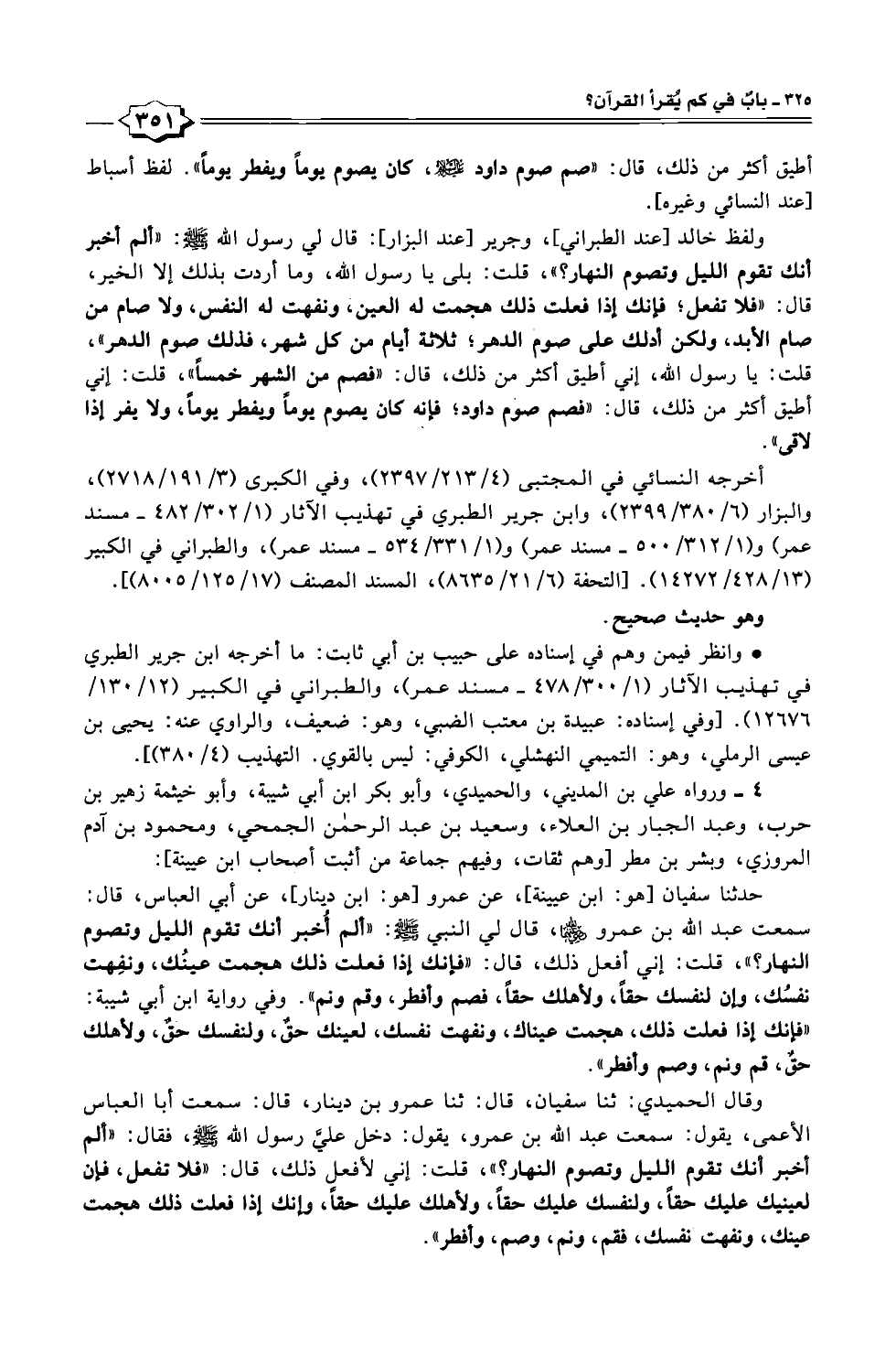 ولفظ خالد عند الطبراني]، وجرير [عند البزار]: قال لي رسول الله - صلى الله عليه وسلم -: "ألم أخبر أنك تقوم الليل وتصوم النهار؟ "، قلت: بلى يا رسول الله، وما أردت بذلك إلا الخير، قال: "فلا تفعل؛ فإنك إذا فعلت ذلك هجمت له العين، ونفهت له النفس، ولا صام من صام الأبد، ولكن أدلك على صوم الدهر؛ ثلالة أيام من كل شهر، فذلك صوم الدهر"، قلت: يا رسول الله، إني أطيق أكثر من ذلك، قال: "فصم من الشهر خمسًا"، قلت: إني أطيق أكثر من ذلك، قال: "فصم صوم داود؛ فإنه كان يصوم يومًا ويفطر يومًا، ولا يفر إذا لاقى".