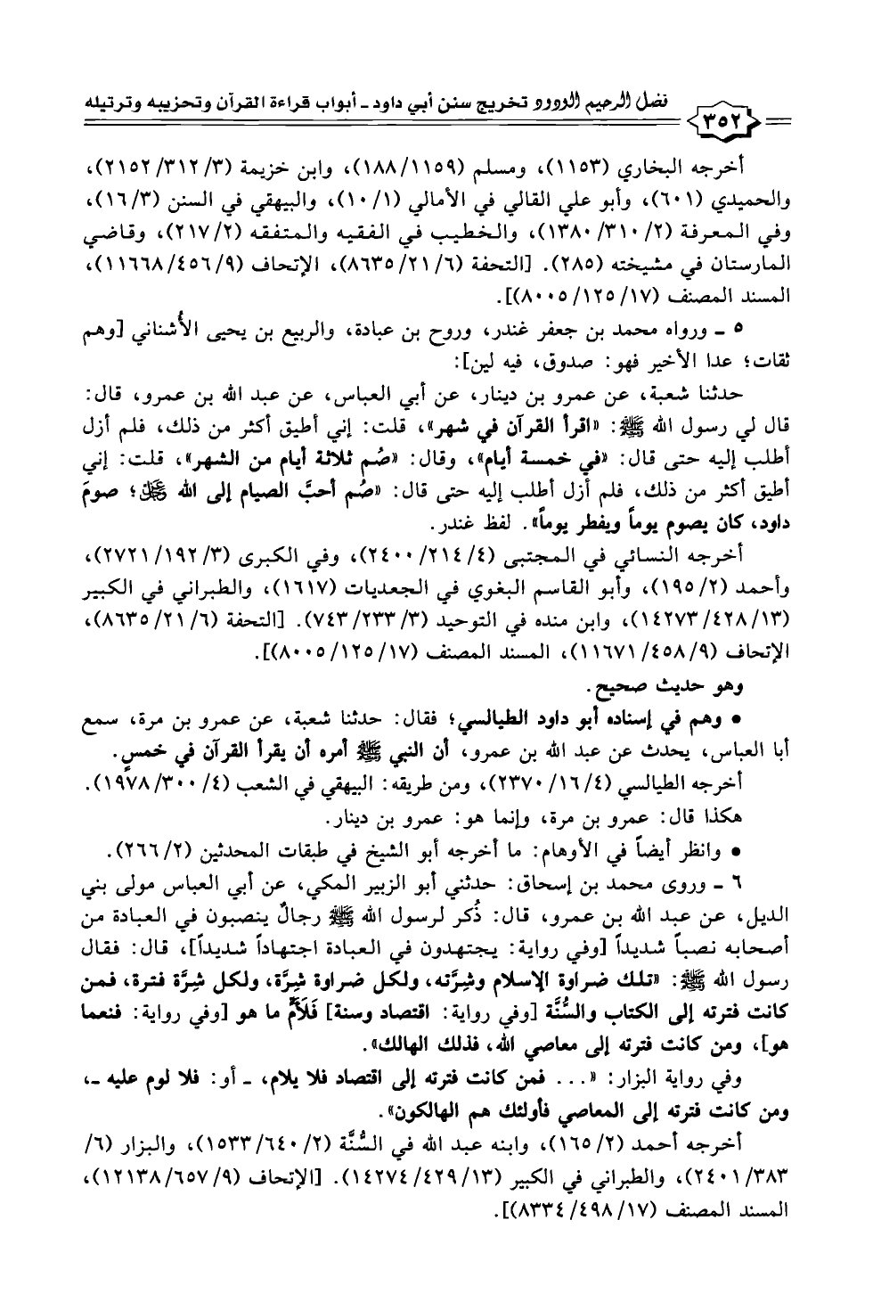 • وهم في إسناده أبو داود الطيالسي؛ فقال: حدثنا شعبة، عن عمرو بن مرة، سمع أبا العباس، يحدث عن عبد الله بن عمرو، أن النبي - صلى الله عليه وسلم - أمره أن يقرأ القرآن في خمسٍ.