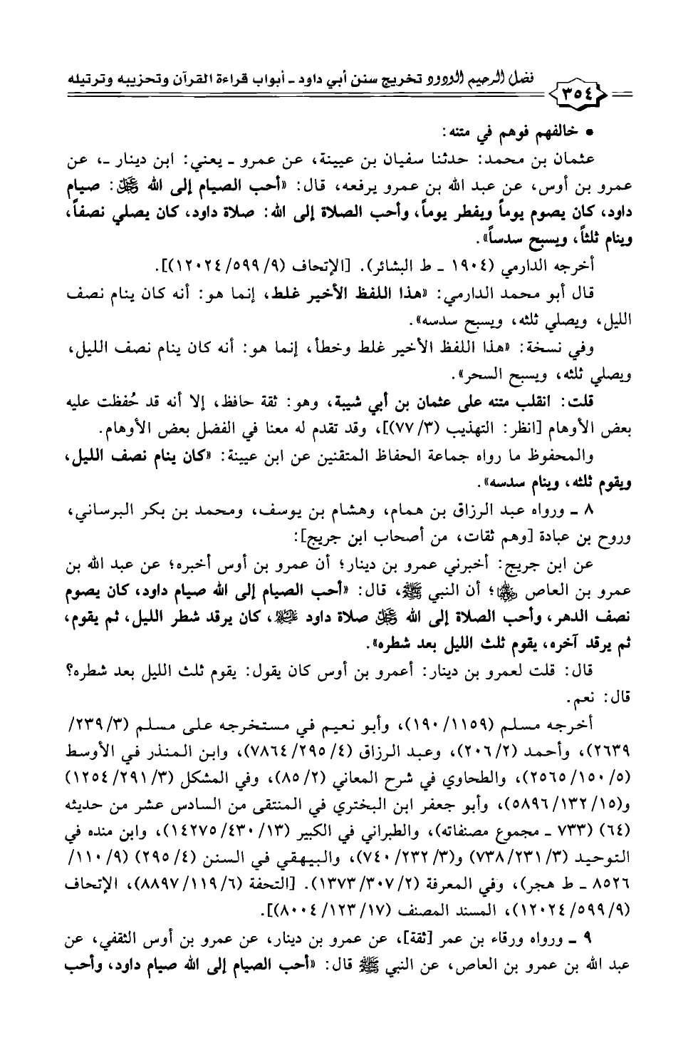 قال أبو محمد الدارمي: "هذا اللفظ الأخير غلط، إنما هو: أنه كان ينام نصف الليل، ويصلي ثلثه، ويسبح سدسه".
