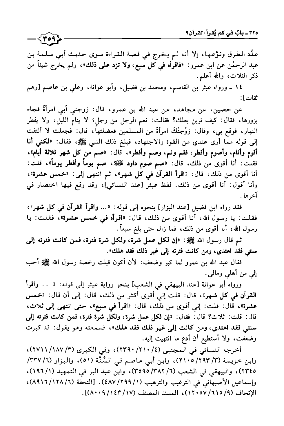 ورواه أبو عوانة [عند البيهقي في الشعب] بنحو رواية عبثر إلى قوله: " ... واقرأ القرآن في كل شهر"، قال: قلت إني أقوى أكثر من ذلك، قال: إلى أن قال: "خمس عشرة"، قال: قلت: إني أقوى من ذلك، قال: "اقرأ في سبع"، حتى انتهى إلى ثلاث، قال: قلت: ثلاث؟ قال: فقال: "إن لكل عمل شرة، ولكل شرة فترة، فمن كانت فترته إلى سنتي فقد اهتدى، ومن كانت إلى غير ذلك فقد هلك"، فسمعته وهو يقول: قد كبرت وضعفت، ولا أستطيع أن أدع ما انتهيت إليه.