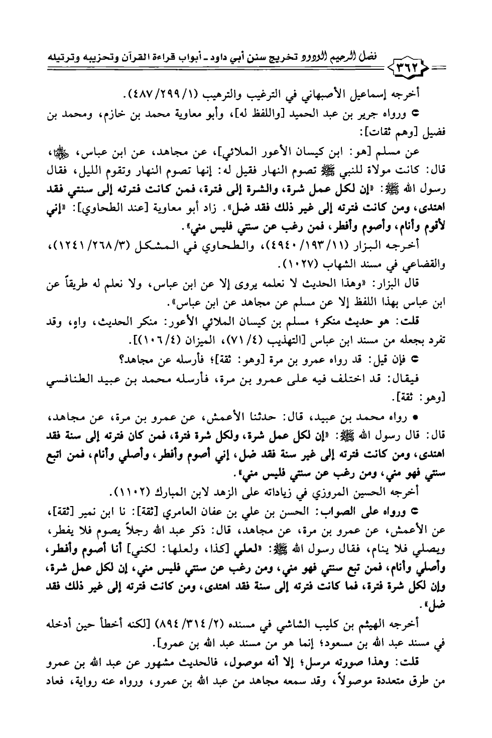 عن مسلم [هو: ابن كيسان الأعور الملائي]، عن مجاهد، عن ابن عباس، - رضي الله عنهما -، قال: كانت مولاة للنبي - صلى الله عليه وسلم - تصوم النهار فقيل له: إنها تصوم النهار وتقوم الليل، فقال رسول الله - صلى الله عليه وسلم -: "إن لكل عمل شرة، والشرة إلى فترة، فمن كانت فترته إلى سنتي فقد اهتدى، ومن كانت فترته إلى غير ذلك فقد ضل". زاد أبو معاوية [عند الطحاوي]: "إني لأقوم وأنام، وأصوم وأفطر، فمن رغب عن سنتي فليس مني".