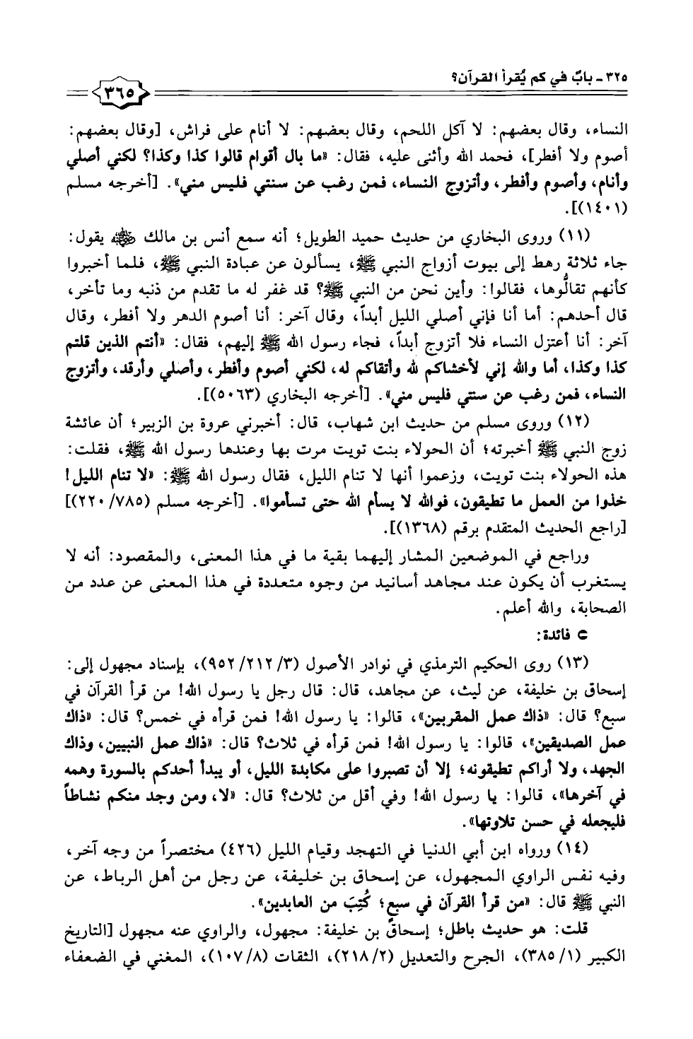 ١٣ - روى الحكيم الترمذي في نوادر الأصول (٣/ ٢١٢/ ٩٥٢)، بإسناد مجهول إلى: إسحاق بن خليفة، عن ليث، عن مجاهد، قال: قال رجل يا رسول الله! من قرأ القرآن في سبع؟ قال: "ذاك عمل المقربين"، قالوا: يا رسول الله! فمن قرأه في خمس؟ قال: "ذاك عمل الصديقين"، قالوا: يا رسول الله! فمن قرأه في ثلاث؟ قال: "ذاك عمل النبيين، وذاك الجهد، ولا أراكم تطيقونه؛ إلا أن تصبروا على مكابدة الليل، أو يبدأ أحدكم بالسورة وهمه في آخرها"، قالوا: يا رسول الله! وفي أقل من ثلاث؟ قال: "لا، ومن وجد منكم نشاطًا فليجعله في حسن تلاوتها".