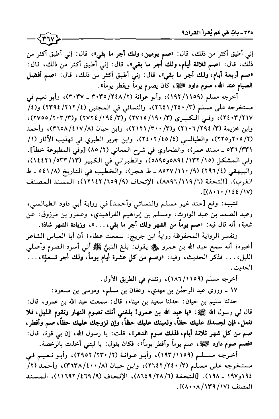 حدثنا سليم بن حيان: حدثنا سعيد بن ميناء، قال: سمعت عبد الله بن عمرو، قال: قال لي رسول الله - صلى الله عليه وسلم -: "يا عبد الله بن عمرو! بلفني أنك تصوم النهار وتقوم الليل، فلا تفعل، فإن لجسدك عليك حظًا، ولعينك عليك حظًا، وإن لزوجك عليك حظًا، صم وأفطر، صم من كل شهر ثلاثة أيام، فذلك صوم الدهر"، قلت: يا رسول الله، إن بي قوة، قال: "فصم صوم داود -عليه السلام -، صم يومًا"، وأفطر يومًا، فكان يقول: يا ليتني أخذت بالرخصة.