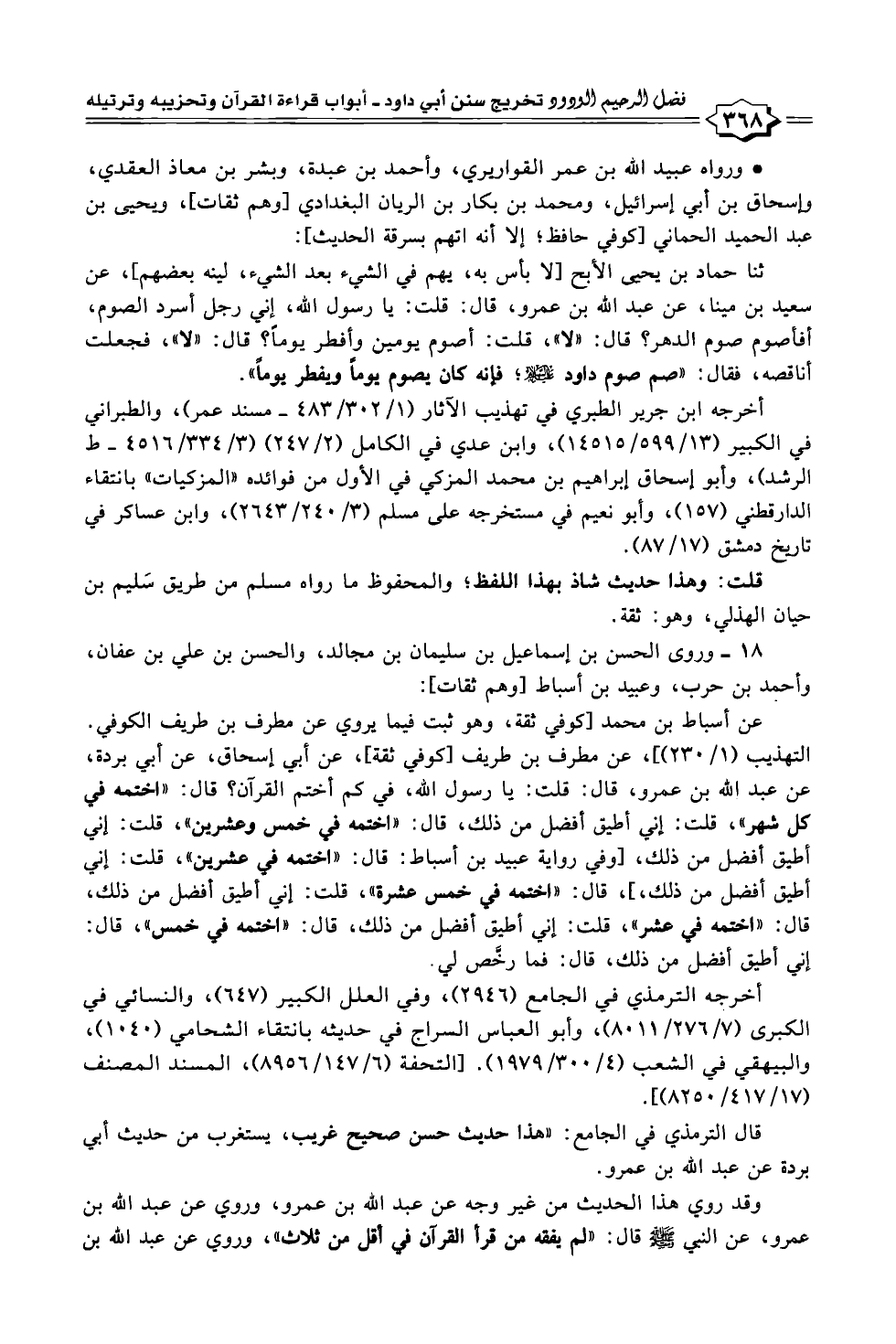 وقد روي هذا الحديث من غير وجه عن عبد الله بن عمرو، وروي عن عبد الله بن عمرو، عن النبي - صلى الله عليه وسلم - قال: "لم يفقه من قرأ القرآن في أقل من ثلاث"، وروي عن عبد الله بن