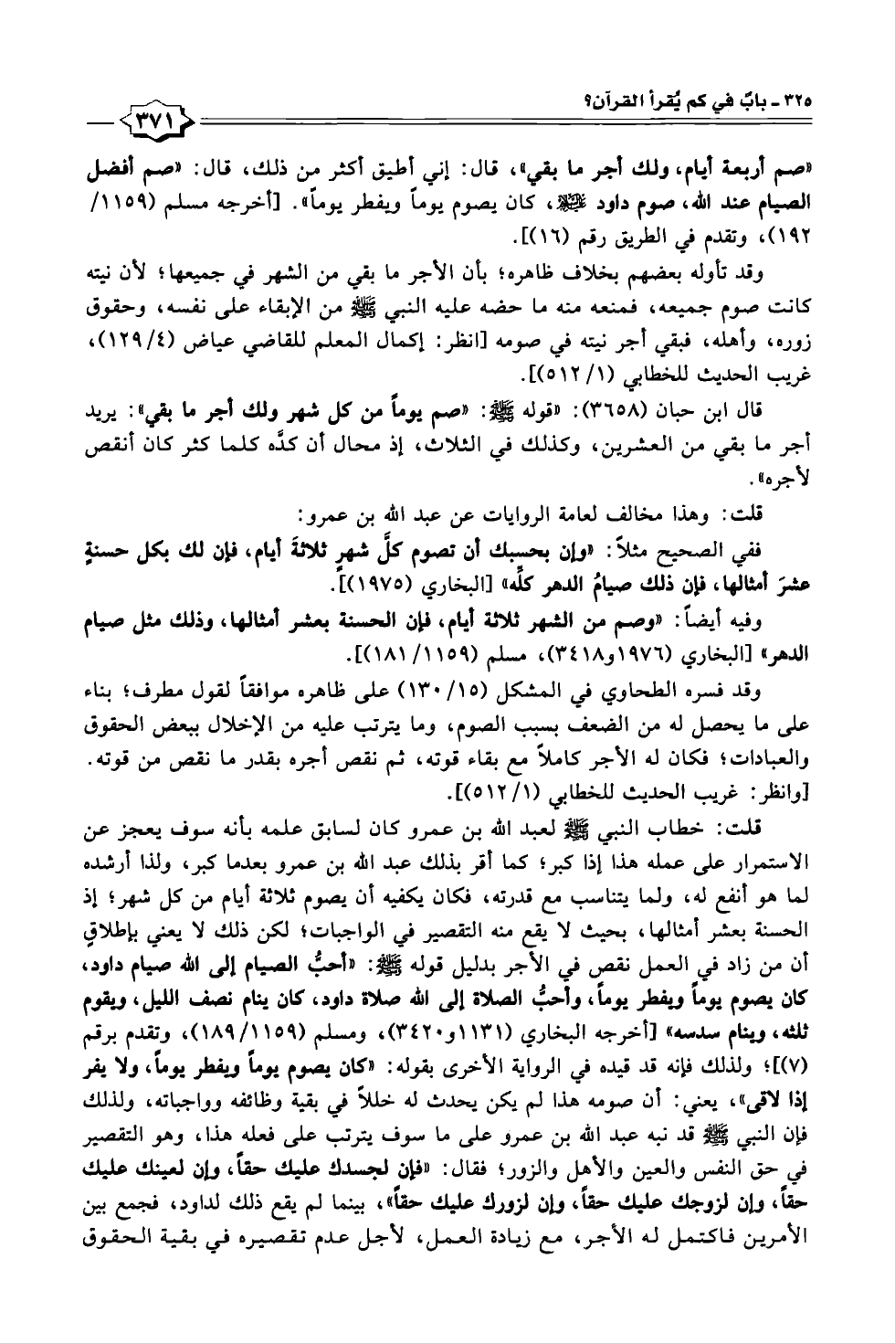 قلت: خطاب النبي - صلى الله عليه وسلم - لعبد الله بن عمرو كان لسابق علمه بأنه سوف يعجز عن الاستمرار على عمله هذا إذا كبر؛ كما أقر بذلك عبد الله بن عمرو بعدما كبر، ولذا أرشده لما هو أنفع له، ولما يتناسب مع قدرته، فكان يكفيه أن يصوم ثلاثة أيام من كل شهر؛ إذ الحسنة بعشر أمثالها، بحيث لا يقع منه التقصير في الواجبات؛ لكن ذلك لا يعني بإطلاقِ أن من زاد في العمل نقص في الأجر بدليل قوله - صلى الله عليه وسلم -: "أحبُّ الصيام إلى الله صيام داود، كان يصوم يومًا ويفطر يومًا، وأحب الصلاة إلى الله صلاة داود، كان ينام نصف الليل، ويقوم ثلثه، وينام سدسه" [أخرجه البخاري (١١٣١ و ٣٤٢٠)، ومسلم (١١٥٩/ ١٨٩)، وتقدم برقم (٧)]؛ ولذلك فإنه قد قيده في الرواية الأخرى بقوله: "كان يصوم يومًا ويفطر يومًا، ولا يفر إذا لاقى"، يعني: أن صومه هذا لم يكن يحدث له خللًا في بقية وظائفه وواجباته، ولذلك فإن النبي - صلى الله عليه وسلم - قد نبه عبد الله بن عمرو على ما سوف يترتب على فعله هذا، وهو التقصير في حق النفس والعين والأهل والزور؛ فقال: "فإن لجسدك عليك حقًا، وإن لعينك عليك حقًا، وإن لزوجك عليك حقًا، وإن لزورك عليك حقًا"، بينما لم يقع ذلك لداود، فجمع بين الأمرين فاكتمل له الأجر، مع زيادة العمل، لأجل عدم تقصيره في بقية الحقوق