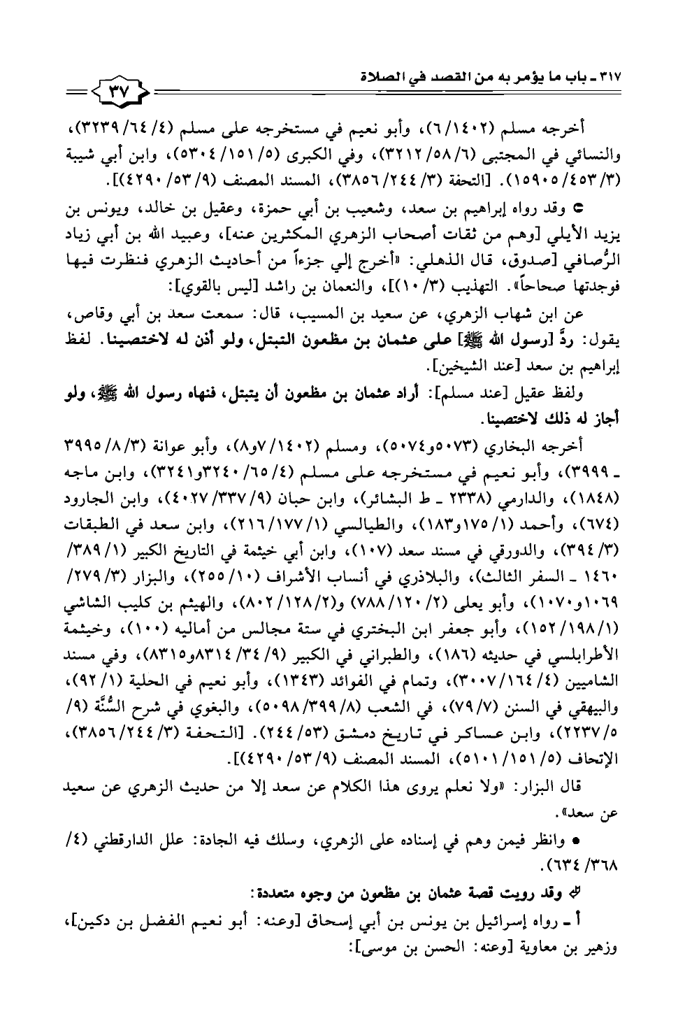 عن ابن شهاب الزهري، عن سعيد بن المسيب، قال: سمعت سعد بن أبي وقاص، يقول: ردَّ [رسول الله - صلى الله عليه وسلم -] على عثمان بن مظعون التبتل، ولو أذن له لاختصينا. لفظ إبراهيم بن سعد [عند الشيخين].