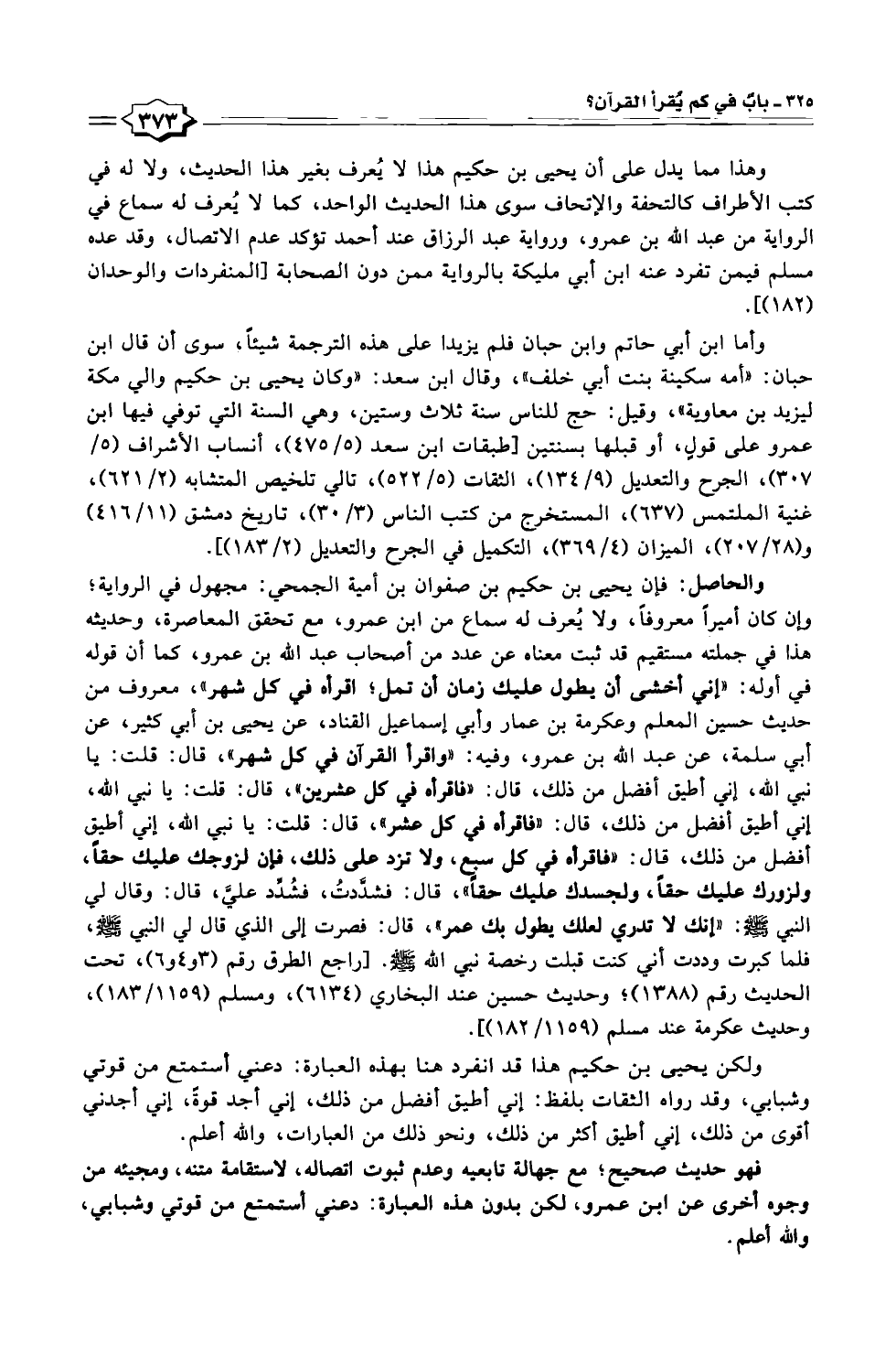 والحاصل: فإن يحيى بن حكيم بن صفوان بن أمية الجمحي: مجهول في الرواية؛ وإن كان أميرًا معروفًا، ولا يُعرف له سماع من ابن عمرو؛ مع تحقق المعاصرة، وحديثه هذا في جملته مستقيم قد ثبت معناه عن عدد من أصحاب عبد الله بن عمرو، كما أن قوله في أوله: "إني أخشى أن يطول عليك زمان أن تمل؛ اقرأه في كل شهر"، معروف من حديث حسين المعلم وعكرمة بن عمار وأبي إسماعيل القناد، عن يحيى بن أبي كثير، عن أبي سلمة، عن عبد الله بن عمرو، وفيه: "واقرأ القرآن في كل شهر"، قال: قلت: يا نبي الله، إني أطيق أفضل من ذلك، قال: "فاقرأه في كل عشرين"، قال: قلت: يا نبي الله، إني أطيق أفضل من ذلك، قال: "فاقرأه في كل عشر"، قال: قلت: يا نبي الله، إني أطيق أفضل من ذلك، قال: "فاقرأه في كل سبع، ولا تزد على ذلك، فإن لزوجك عليك حقًا، ولزورك عليك حقًا، ولجسدك عليك حقًا"، قال: فشدَّدتُ، فشُدِّد علىَّ، قال: وقال لي النبي - صلى الله عليه وسلم -: "إنك لا تدري لعلك يطول بك عمر"، قال: فصرت إلى الذي قال لي النبي - صلى الله عليه وسلم -، فلما كبرت وددت أني كنت قبلت رخصة نبي الله - صلى الله عليه وسلم -. [راجع الطرق رقم (٣ و ٤ و ٦)، تحت الحديث رقم (١٣٨٨)؛ وحديث حسين عند البخاري (٦١٣٤)، ومسلم (١١٥٩/ ١٨٣)، وحديث عكرمة عند مسلم (١١٥٩/ ١٨٢)].