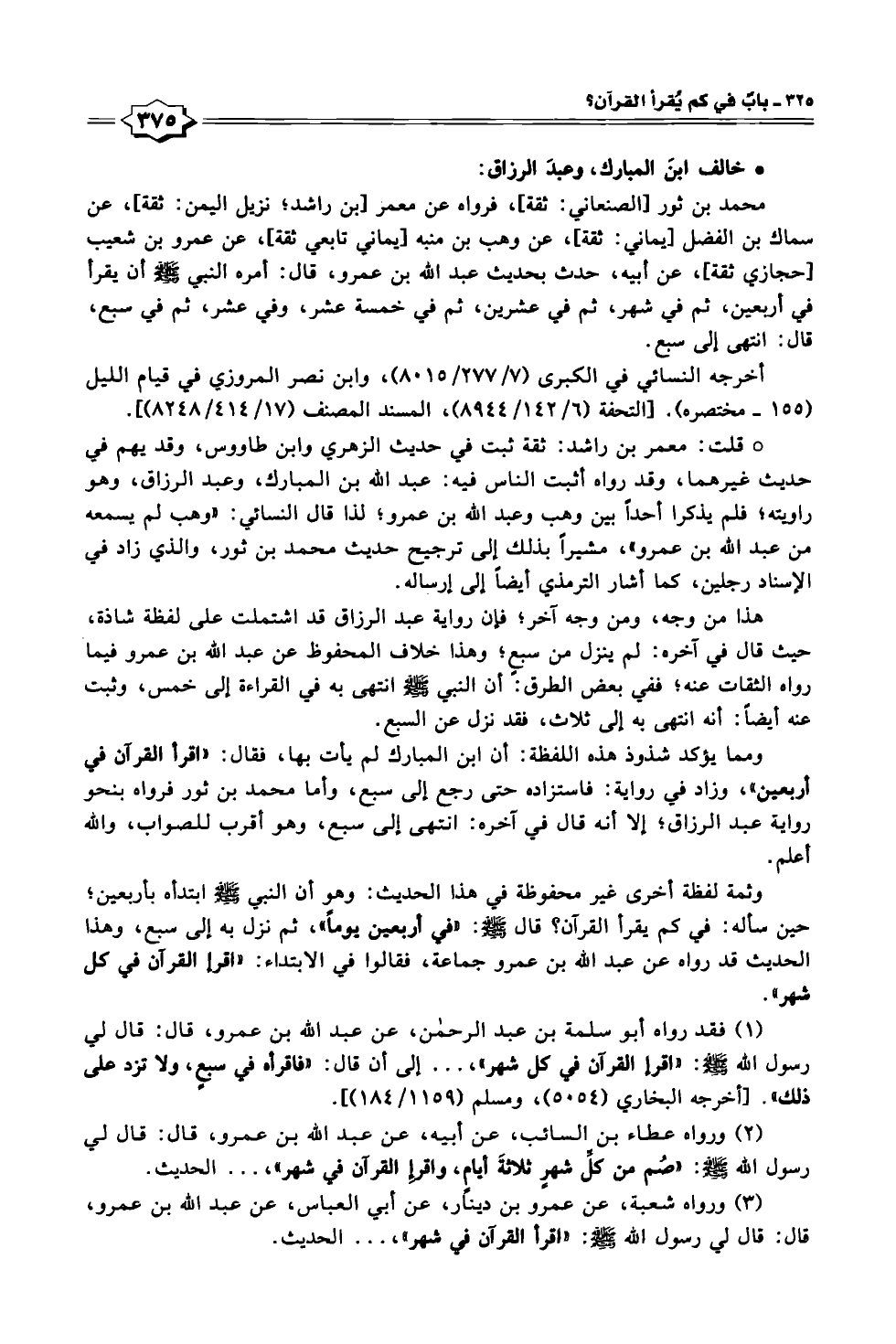 محمد بن ثور [الصنعاني: ثقة]، فرواه عن معمر [بن راشد؛ نزيل اليمن: ثقة]، عن سماك بن الفضل [يماني: ثقة]، عن وهب بن منبه [يماني تابعي ثقة]، عن عمرو بن شعيب [حجازي ثقة]، عن أبيه، حدث بحديث عبد الله بن عمرو، قال: أمره النبي - صلى الله عليه وسلم - أن يقرأ في أربعين، ثم في شهر، ثم في عشرين، ثم في خمسة عشر، وفي عشر، ثم في سبع، قال: انتهى إلى سبع.