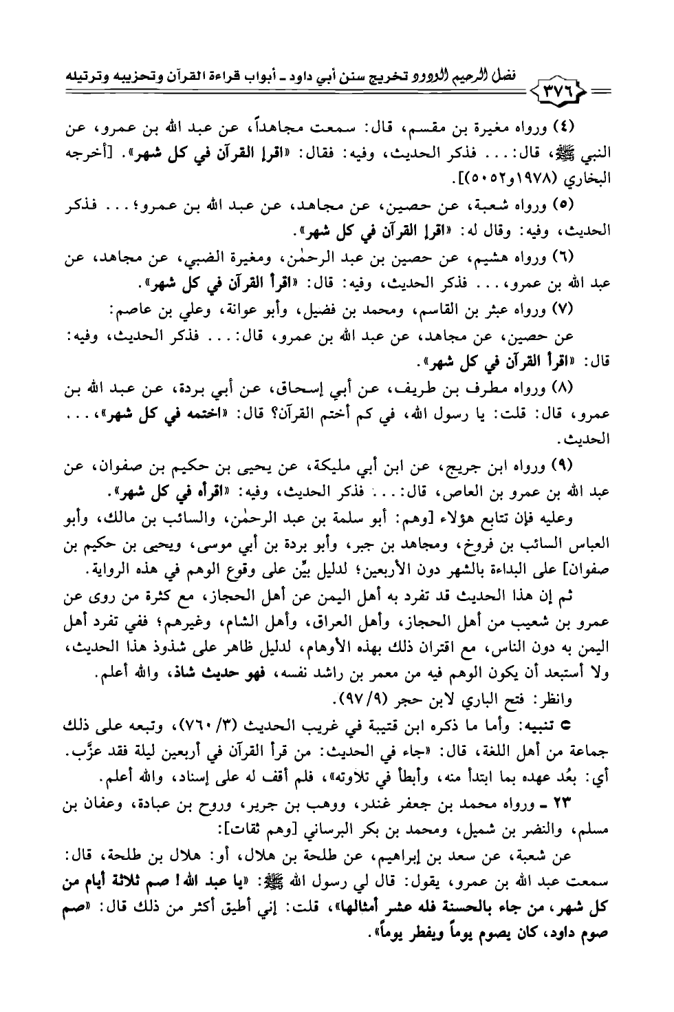 ٧ - ورواه عبثر بن القاسم، ومحمد بن فضيل، وأبو عوانة، وعلي بن عاصم: عن حصين، عن مجاهد، عن عبد الله بن عمرو، قال: ... فذكر الحديث، وفيه: قال: "اقرأ القرأن في كل شهر".