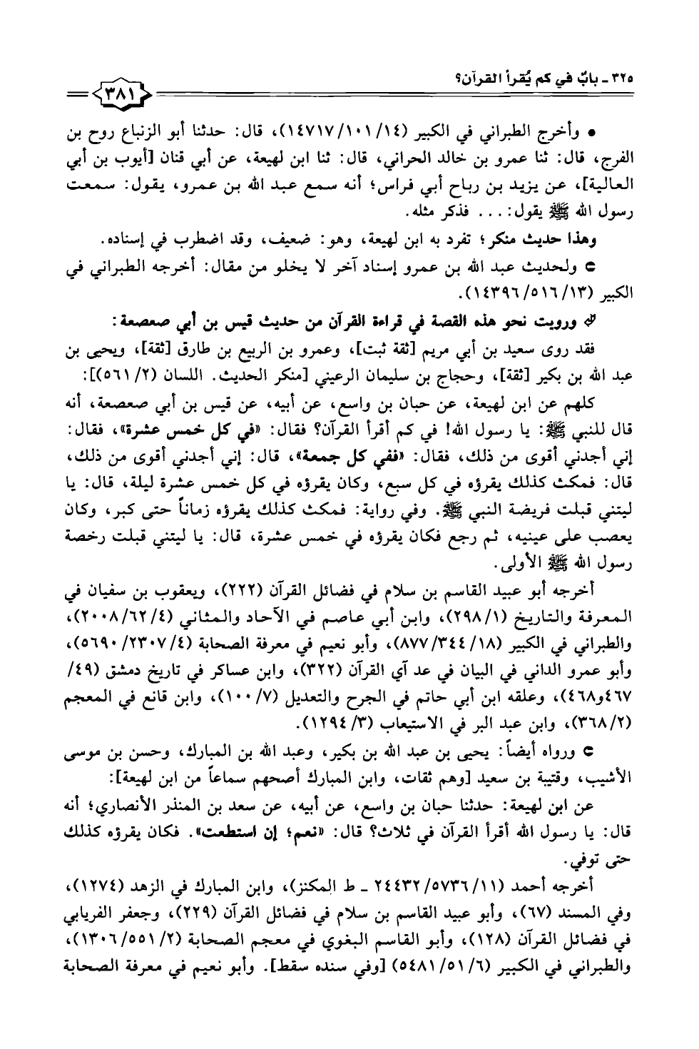 كلهم عن ابن لهيعة، عن حبان بن واسع، عن أبيه، عن قيس بن أبي صعصعة، أنه قال للنبي - صلى الله عليه وسلم -: يا رسول الله! في كم أقرأ القرآن؟ فقال: "في كل خمس عشرة"، فقال: إني أجدني أقوى من ذلك، فقال: "ففي كل جمعة"، قال: إني أجدني أقوى من ذلك، قال: فمكث كذلك يقرؤه في كل سبع، وكان يقرؤه في كل خمس عشرة ليلة، قال: يا ليتني قبلت فريضة النبي - صلى الله عليه وسلم -. وفي رواية: فمكث كذلك يقرؤه زمانًا حتى كبر، وكان يعصب على عينيه، ثم رجع فكان يقرؤه في خمس عشرة، قال: يا ليتني قبلت رخصة رسول الله - صلى الله عليه وسلم - الأولى.