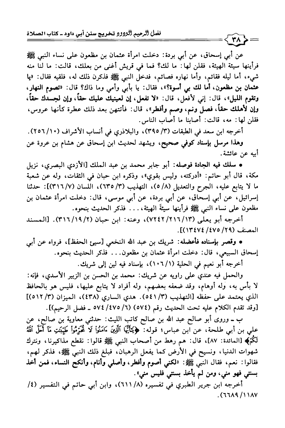 • سلك فيه الجادة فوصله: أبو جابر محمد بن عبد الملك [الأزدي البصري، نزيل مكة، قال أبو حاتم: "أدركته، وليس بقوي"، وذكره ابن حبان في الثقات، وله عن شعبة ما لا يتابع عليه، الجرح والتعديل (٨/ ٥)، التهذيب (٣/ ٦٣٥)، اللسان (٧/ ٣١٦)]: حدثنا إسرائيل، عن أبي إسحاق، عن أبي بردة، عن أبي موسى، قال: دخلت امرأة عثمان بن مظعون على نساء النبي - صلى الله عليه وسلم - فرأينها سيئةَ الهيئة، ... فذكر الحديث بنحوه.