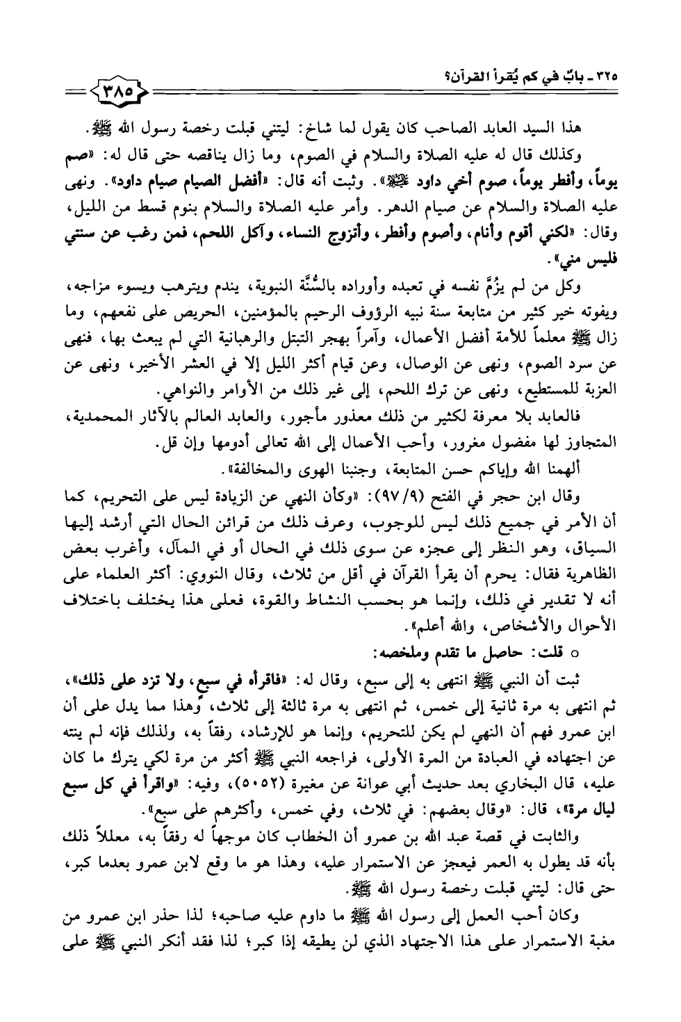 وكذلك قال له عليه الصلاة والسلام في الصوم، وما زال يناقصه حتى قال له: (صم يومًا، وأفطر يومًا، صوم أخي داود -عليه السلام-. وثبت أنه قال: "أفضل الصيام صيام داود". ونهى عليه الصلاة والسلام عن صيام الدهر. وأمر عليه الصلاة والسلام بنوم قسط من الليل، وقال: "لكني أقوم وأنام، وأصوم وأفطر، وأتزوج النساء، وآكل اللحم، فمن رغب عن سنتي فليس مني".