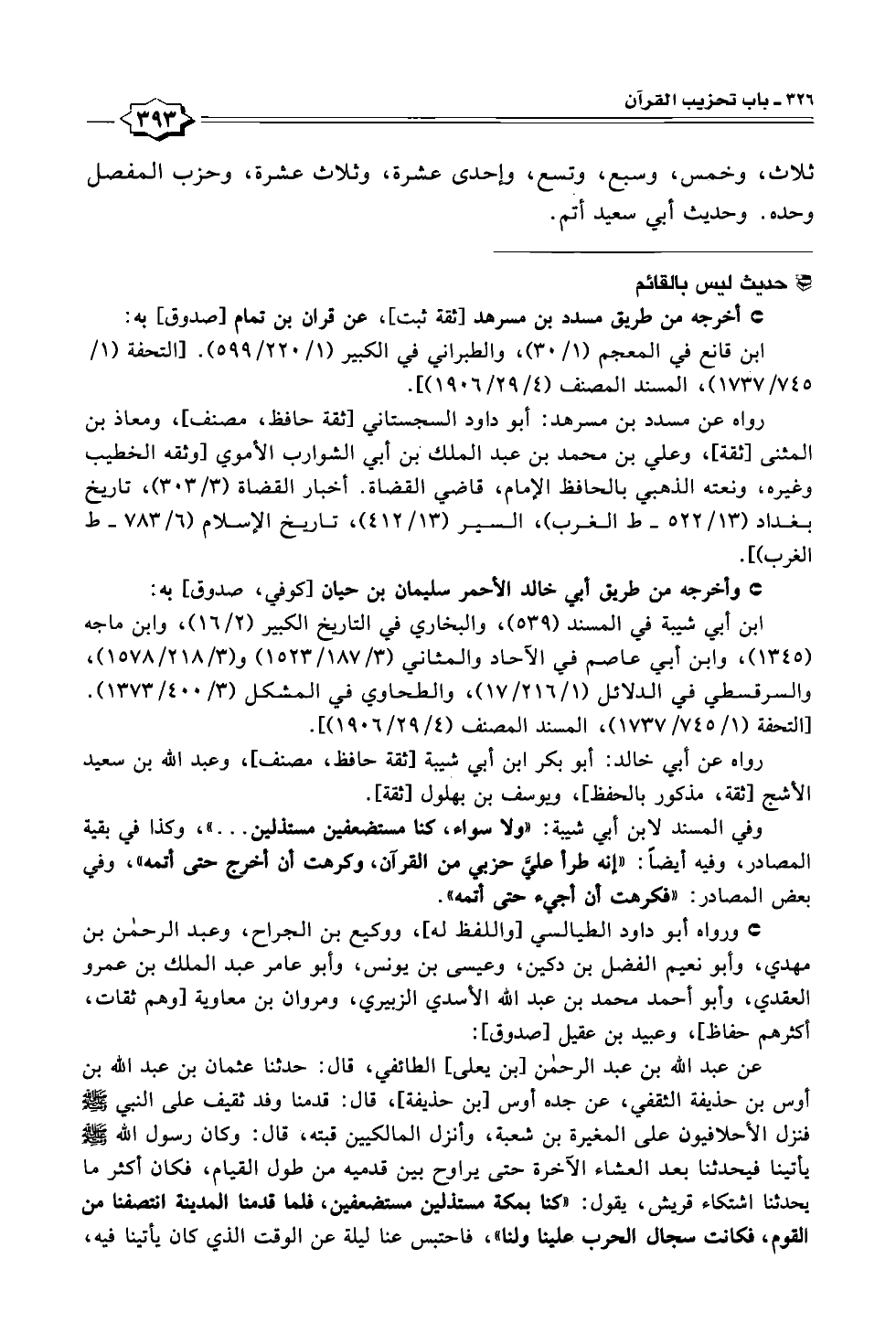 رواه عن مسدد بن مسرهد: أبو داود السجستاني [ثقة حافظ] مصنف]، ومعاذ بن المثنى [ثقة]، وعلي بن محمد بن عبد الملك ابن أبي الشوارب الأموي [وثقه الخطيب وغيره، ونعته الذهبي بالحافظ الإمام، قاضي القضاة. أخبار القضاة (٣/ ٣٠٣)، تاريخ بغداد (١٣/ ٥٢٢ - ط الغرب)، السير (١٣/ ٤١٢)، تاريخ الإسلام (٦/ ٧٨٣ - ط الغرب)].