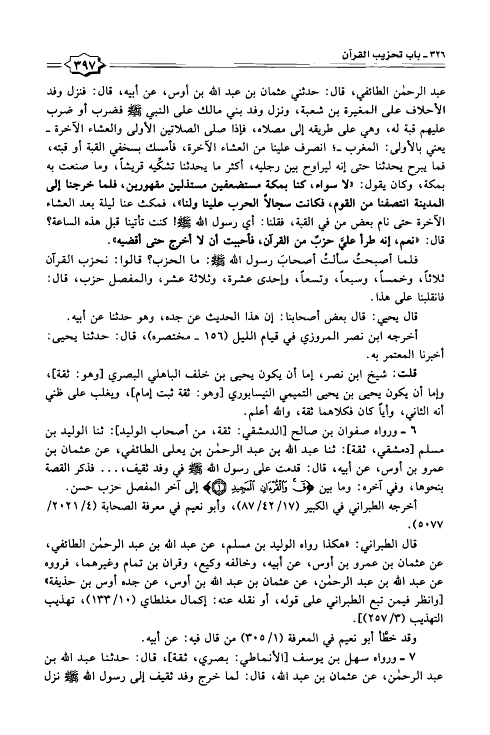 ٦ - ورواه صفوان بن صالح [الدمشقي: ثقة، من أصحاب الوليد]: ثنا الوليد بن مسلم [دمشقي، ثقة]: ثنا عبد الله بن عبد الرحمن بن يعلى الطائفي، عن عثمان بن عمرو بن أوس، عن أبيه، قال: قدمت على رسول الله -صلى الله عليه وسلم- في وفد ثقيف، ... فذكر القصة بنحوها، وفي آخره: وما بين {ق وَالْقُرْآنِ الْمَجِيدِ (١)} إلى آخر المفصل حزب حسن.
