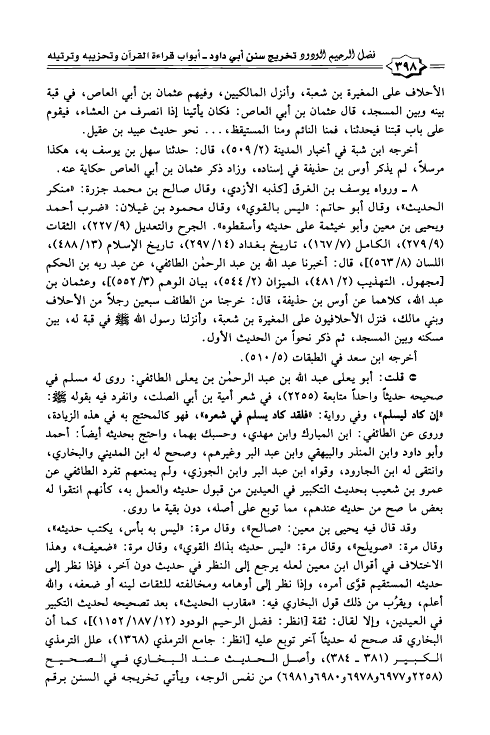 قلت: أبو يعلى عبد الله بن عبد الرحمن بن يعلى الطائفي: روى له مسلم في صحيحه حديثًا واحدًا متابعة (٢٢٥٥)، في شعر أمية بن أبي الصلت، وانفرد فيه بقوله -صلى الله عليه وسلم-: "إن كاد ليسلم"، وفي رواية: "فلقد كاد يسلم فبم شعره"، فهو كالمحتج به في هذه الزيادة، وروى عن الطائفي: ابن المبارك وابن مهدي، وحسبك بهما، واحتج بحديثه أيضًا: أحمد وأبو داود وابن المنذر والبيهقي وابن عبد البر وغيرهم، وصحح له ابن المديني والبخاري، وانتقى له ابن الجارود، وقواه ابن عبد البر وابن الجوزي، ولم يمنعهم تفرد الطائفي عن عمرو بن شعيب بحديث التكبير في العيدين من قبول حديثه والعمل به، كأنهم انتقوا له بعض ما صح من حديثه عندهم، مما توبع على أصله، دون بقية ما روى.