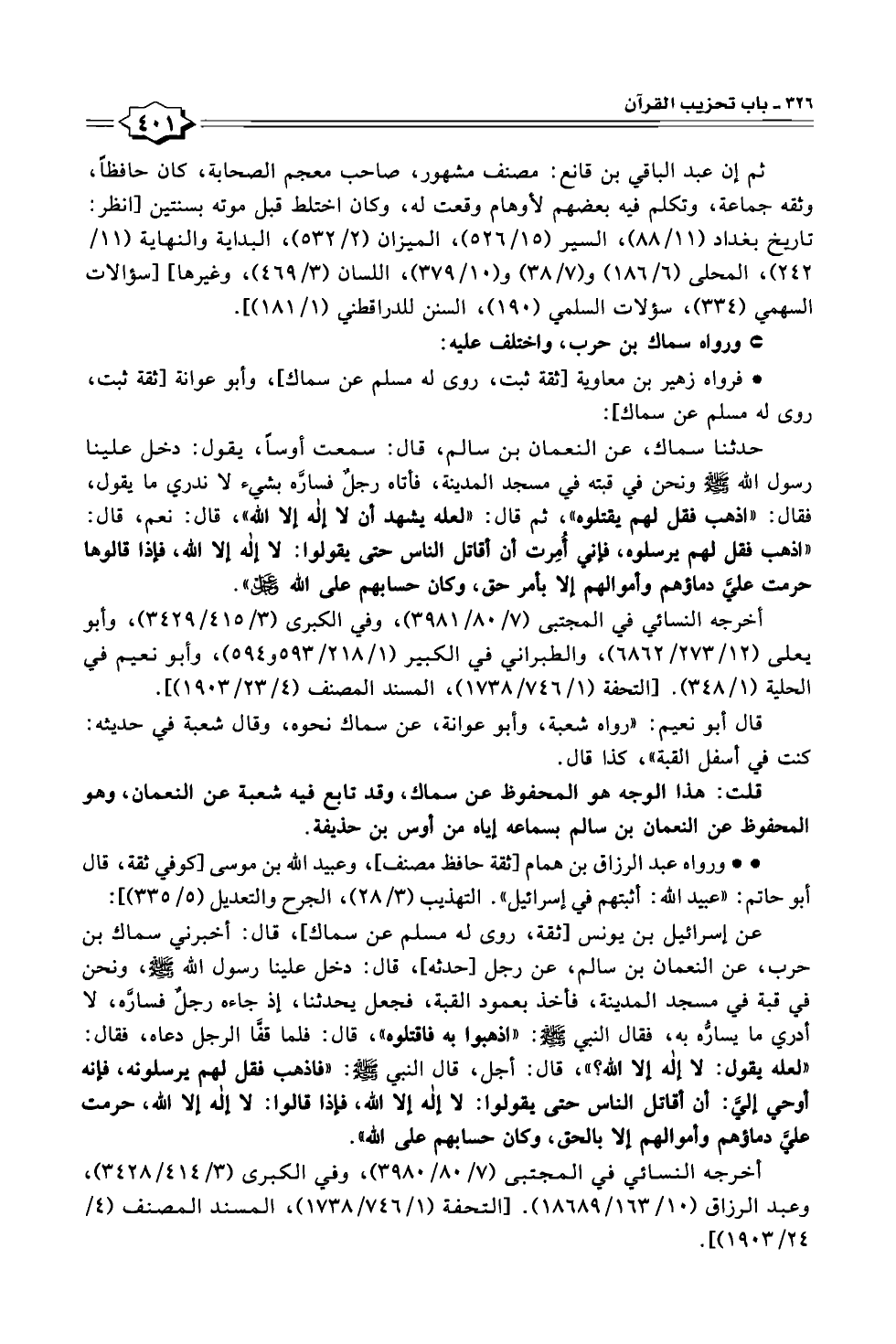 ثم إن عبد الباقي بن قانع: مصنف مشهور، صاحب معجم الصحابة، كان حافظًا، وثقه جماعة، وتكلم فيه بعضهم لأوهام وقعت له، وكان اختلط قبل موته بسنتين [انظر: تاريخ بغداد (١١/ ٨٨)، السير (١٥/ ٥٢٦)، الميزان (٢/ ٥٣٢)، البداية والنهاية (١١/ ٢٤٢)، المحلى (٦/ ١٨٦) و (٧/ ٣٨) و (١٠/ ٣٧٩)، اللسان (٣/ ٤٦٩)، وغيرها] [سؤالات السهمي (٣٣٤)، سؤلات السلمي (١٩٠)، السنن للدراقطني (١/ ١٨١)].