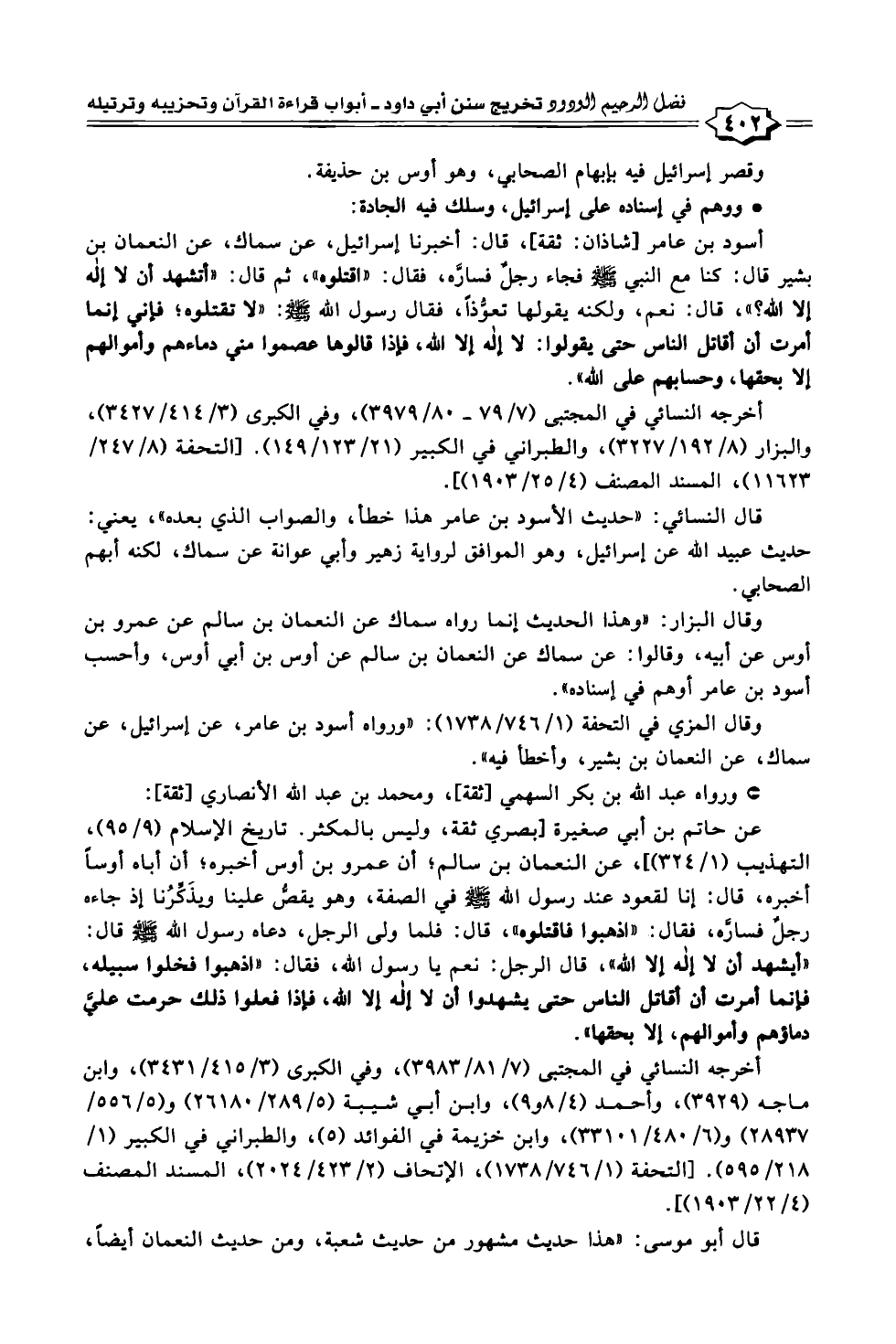 أسود بن عامر [شاذان: ثقة]، قال: أخبرنا إسراثيل، عن سماك، عن النعمان بن بشير قال: كنا مع النبي -صلى الله عليه وسلم- فجاء رجل فسارَّه، فقال: "اقتلوه"، ثم قال: "أتشهد أن لا إله إلا الله؟ "، قال: نعم، ولكنه يقولها تعوُّذًا، فقال رسول الله -صلى الله عليه وسلم-: "لا تقتلوه؛ فإني إنما أمرت أن أقاتل الناس حتى يقولوا: لا إله إلا اله، فإذا قالوها عصموا مني دماءهم وأموالهم إلا بحقها، وحسابهم على الله".