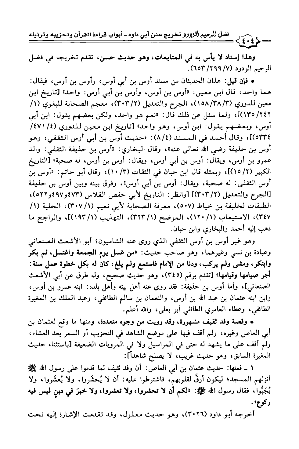 فإن قيل: هذان الحديثان من مسند أوس بن أبي أوس، وأوس بن أوس، فيقال: هما واحد، قال ابن معين: "أوس بن أوس، وأوس بن أبي أوس: واحد" [تاريخ ابن معين للدوري (٣/ ٣٨/ ١٥٨)، الجرح والتعديل (٢/ ٣٠٣)، معجم الصحابة للبغوي (١/ ٢٤٢/ ١٣٥)]، ولما سئل عن ذلك قال: "نعم هو واحد، ولكن بعضهم يقول: ابن أبي أوس، وبعضهم يقول: ابن أوس، وهو واحد" [تاريخ ابن معين للدوري (٤/ ٤٧١/ ٥٣٣٤)]، وقال أحمد في المسند (٤/ ٨): "حديث أوس بن أبي أوس الثقفي، وهو أوس بن حذيفة رضي الله تعالى عنه"، وقال البخاري: "أوس بن حذيفة الثقفي: والد عمرو بن أوس، ويقال: أوس بن أبي أوس، ويقال: أوس بن أوس، له صحبة" [التاريخ الكبير (٢/ ١٥)]، وبمثله قال ابن حبان في الثقات (٣/ ١٠)، وقال أبو حاتم: "أوس بن أوس الثقفى: له صحبة، ويقال: أوس بن أبي أوس"، وفرق بينه وبين أوس بن حذيفة [الجرح والتعديل (٢/ ٣٠٣)] [وانظر: التاريخ لأبي حفص الفلاس (٤٧٣ و ٤٩٧ و ٥٢٢)، الطبقات لخليفة بن خياط (٥٠٧)، معرفة الصحابة لأبي نعيم (١/ ٣٠٧)، الحلية (١/ ٣٤٧)، الاستيعاب (١/ ١٢٠)، الموضح (١/ ٣٢٣)، التهذيب (١/ ١٩٣)]، والراجح ما ذهب إليه أحمد والبخاري وابن حبان.