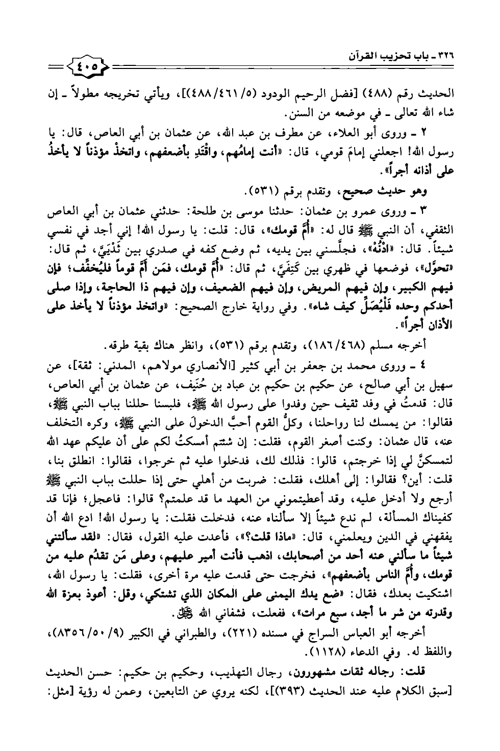 ٢ - وروى أبو العلاء، عن مطرف بن عبد الله، عن عثمان بن أبي العاص، قال: يا رسول الله! اجعلني إمامَ قومي، قال: "أنت إمامُهم، واقْتَدِ بأضعفهم، واتخذ مؤذنًا لا يأخدُ على أذانه أجرًا".