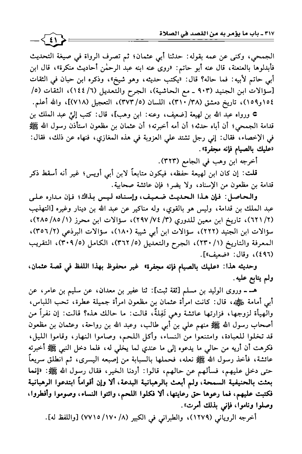 هـ- وروى الوليد بن مسلم [ثقة ثبت]: ثنا عفير بن معدان، عن سليم بن عامر، عن أبي أمامة - رضي الله عنه -، قال: كانت امرأة عثمان بن مظعون امرأة جميلة عطرة، تحب اللباس، والهيأة لزوجها، فزارتها عائشة وهي تَفِلةٌ، قالت: ما حالك هذه؟ قالت: إن نفراً من أصحاب رسول الله - صلى الله عليه وسلم - منهم علي بن أبي طالب، وعبد الله بن رواحة، وعثمان بن مظعون قد تخلوا للعبادة، وامتنعوا من النساء، وأكل اللحم، وصاموا النهار، وقاموا الليل، فكرهت أن أريه من حالي ما يدعوه إلى ما عندي لما يخلي له، فلما دخل النبي - صلى الله عليه وسلم - أخبرته عائشة، فأخذ رسول الله - صلى الله عليه وسلم - نعله، فحملها بالسبابة من إصبعه اليسرى، ثم انطلق سريعاً حتى دخل عليهم، فسألهم عن حالهم، قالوا: أردنا الخير، فقال رسول الله - صلى الله عليه وسلم -: "إنما بعثت بالحنيفية السمحة، ولم أبعث بالرهبانية البدعة، ألا وإن أقواماً ابتدعوا الرهبانية فكتبت عليهم، فما رعوها حق رعايتها، ألا فكلوا اللحم، وائتوا النساء، وصوموا وأفطروا، وصلوا وناموا، فإني بذلك أمرت".