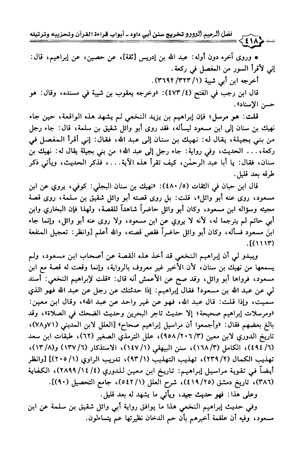 قلت: هو مرسل؛ فإن إبراهيم بن يزيد النخعي لم يشهد هذه الواقعة، حين جاء نهيك بن سنان إلى ابن مسعود ليسأله، فقد روى أبو وائل شقيق بن سلمة، قال: جاء رجل من بني بجيلة، يقال له: نهيك بن سنان إلى عبد الله، فقال: إني أقرأ المفصل في ركعة، ... الحديث، وفي رواية: جاء رجل إلى عبد الله؛ من بني بجيلة يقال له: نهيك بن سنان، فقال: يا أبا عبد الرحمن، كيف تقرأ هذه الآية ... ، فذكر الحديث، ويأتي ذكر طرقه بعد قليل.