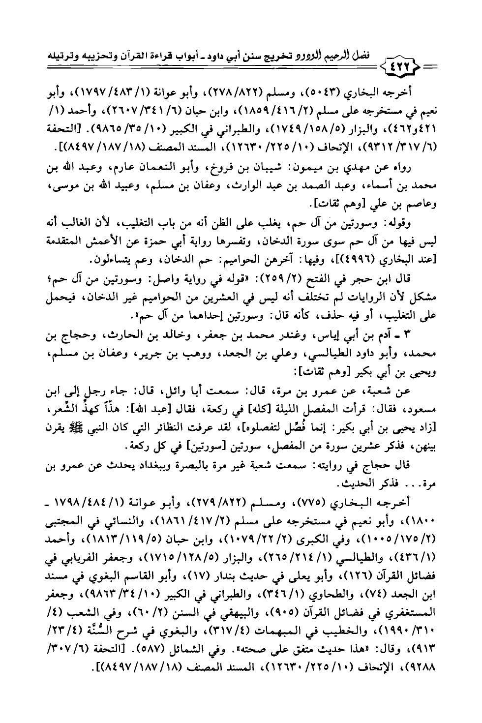 عن شعبة، عن عمرو بن مرة، قال: سمعت أبا وائل، قال: جاء رجل إلى ابن مسعود، فقال: قرأت المفصل الليلة [كله] في ركعة، فقال [عبد الله]: هذًّا كهذِّ الشعر، [زاد يحيى بن أبي بكير: إنما فُصِّل لتفصلوه]، لقد عرفت النظائر التي كان النبي -صلى الله عليه وسلم- يقرن بينهن، فذكر عشرين سورة من المفصل، سورتين [سورتين] في كل ركعة.