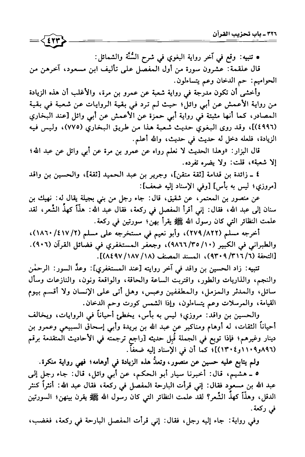 ٥ - هشيم، قال: أخبرنا سيار أبو الحكم، عن أبي وائل، قال: جاء رجل إلى عبد الله بن مسعود فقال: إني قرأت البارحة المفصل في ركعة، فقال عبد الله: أنثرًا كنثر الدقل، وهذًّا كهذِّ الشعر؟ لقد علمت النظائر التي كان رسول الله -صلى الله عليه وسلم- يقرن بينهن؛ السورتين في ركعة.