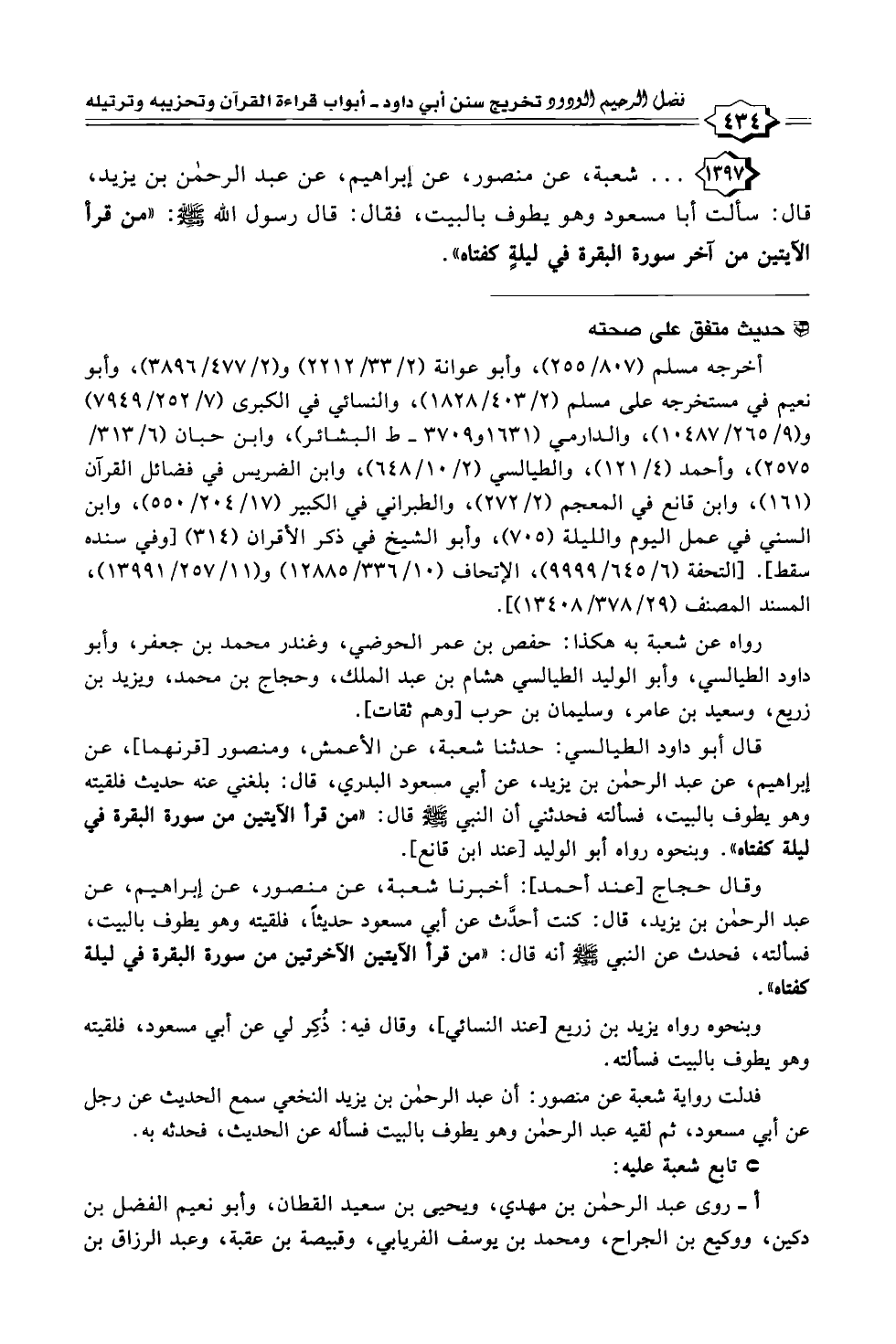 ١٣٩٧ - . . . شعبة، عن منصور، عن إبراهيم، عن عبد الرحمن بن يزيد، قال: سألت أبا مسعود وهو يطوف بالبيت، فقال: قال رسول الله -صلى الله عليه وسلم-: "من قرأ الآيتين من آخر سورة البقرة في ليلةٍ كفتاه".