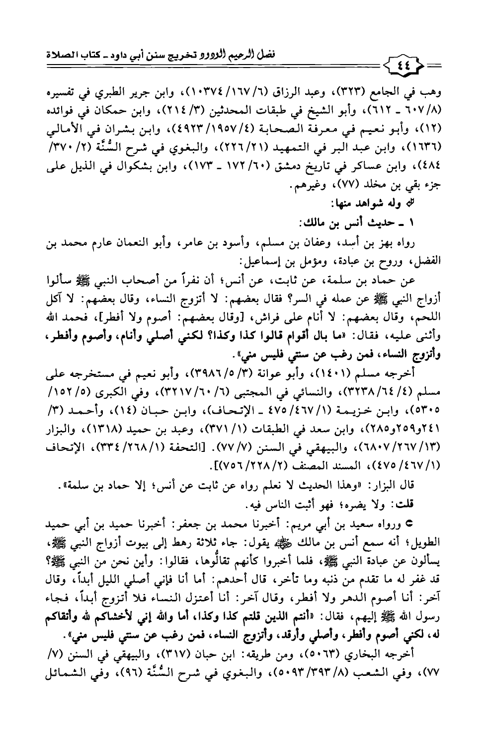 عن حماد بن سلمة، عن ثابت، عن أنس؛ أن نفرًا من أصحاب النبي -صلى الله عليه وسلم- سألوا أزواج النبي -صلى الله عليه وسلم- عن عمله في السر؟ فقال بعضهم: لا أتزوج النساء، وقال بعضهم: لا آكل اللحم، وقال بعضهم: لا أنام على فراش، [وقال بعضهم: أصوم ولا أفطر]، فحمد الله وأثنى عليه، فقال: "ما بال أقوام قالوا كذا وكذا؟ لكني أصلي وأنام، وأصوم وأفطر، وأتزوج النساء، فمن رغب عن سنتي فليس مني".