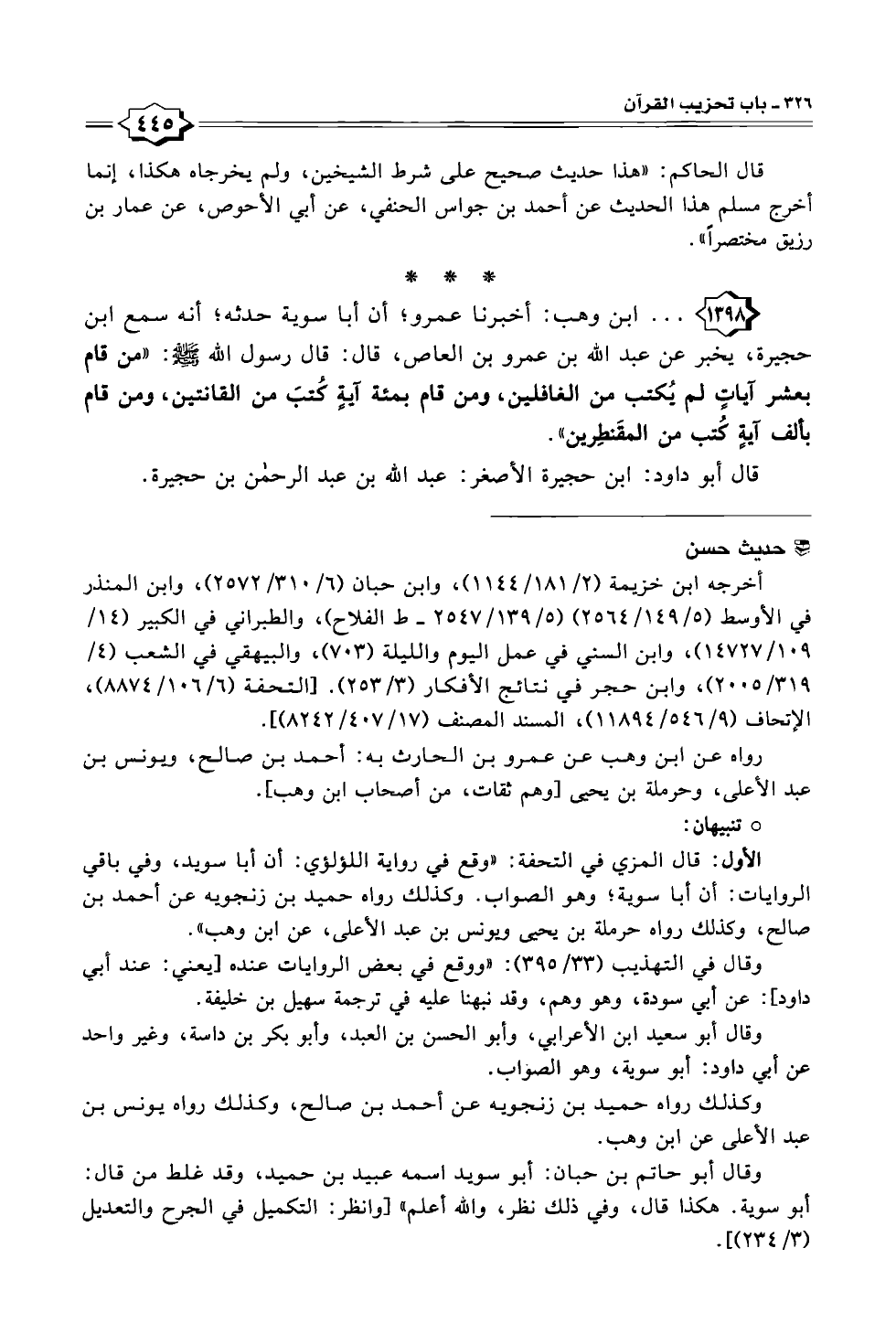 ١٣٩٨ - . . . ابن وهب: أخبرنا عمرو؛ أن أبا سوية حدثه؛ أنه سمع ابن حجيرة، يخبر عن عبد الله بن عمرو بن العاص، قال: قال رسول الله -صلى الله عليه وسلم-: "من قام بعشر آياتٍ لم يُكتب من الغافلين، ومن قام بمثة آيةٍ كُتبَ من القانتين، ومن قام بالف آيةٍ كُتب من المقَنطِرين".