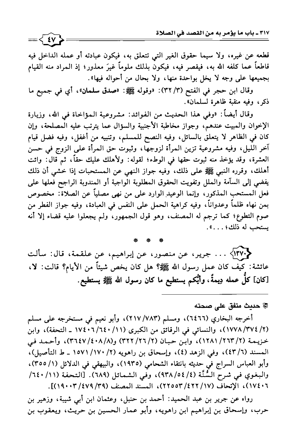 وقال أيضًا: "وفي هذا الحديث من الفوائد: مشروعية المؤاخاة في الله، وزيارة الإخوان والمبيت عندهم، وجواز مخاطبة الأجنبية والسؤال عما يترتب عليه المصلحة، وإن كان في الظاهر لا يتعلق بالسائل، وفيه النصح للمسلم، وتنبيه من أغفل، وفيه فضل قيام آخر الليل، وفيه مشروعية تزين المرأة لزوجها، وثبوت حق المرأة على الزوج في حسن العشرة، وقد يؤخذ منه ثبوت حقها في الوطء؛ لقوله: ولأهلك عليك حقًا، ثم قال: وائت أهلك، وقرره النبي -صلى الله عليه وسلم- على ذلك، وفيه جواز النهي عن المستحبات إذا خشي أن ذلك يفضي إلى السآمة والملل وتفويت الحقوق المطلوبة الواجبة أو المندوبة الراجح فعلها على فعل المستحب المذكور، وإنما الوعيد الوارد على من نهى مصليًا عن الصلاة: مخصوص بمن نهاه ظلمًا وعدوانًا، وفيه كراهية الحمل على النفس في العبادة، وفيه جواز الفطر من صوم التطوع؛ كما ترجم له المصنف، وهو قول الجمهور، ولم يجعلوا عليه قضاء إلا أنه يستحب له ذلك؛ ... ".