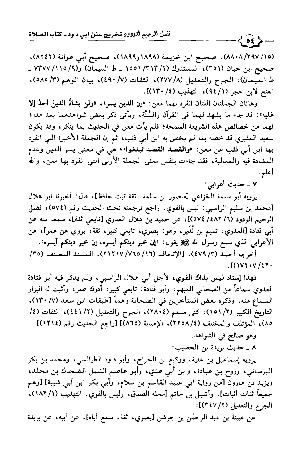 يرويه أبو سلمة الخزاعي [منصور بن سلمة: ثقة ثبت حافظ]، قال: أخبرنا أبو هلال [محمد بن سليم الراسبي: ليس بالقوي. راجع ترجمته تحت الحديث رقم (٥٧٤)، فضل الرحيم الودود (٦/ ٤٨٢/ ٥٧٤)]، عن حميد بن هلال العدوي [تابعي ثقة]، سمعه منه عن أبي قتادة [العدوي، تميم بن نُذَير، وهو: بصري، تابعي كبير، ثقة، يروي عن عمر]، عن الأعرابي الذي سمع رسول الله -صلى الله عليه وسلم- يقول: "إن خير دينكم أيسره، إن خير دينكم أيسره".