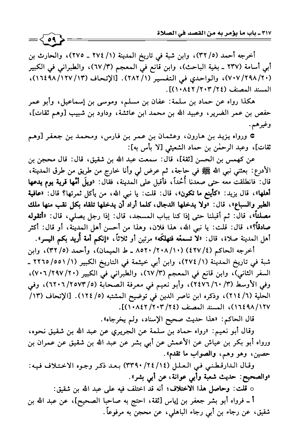 عن كهمس بن الحسن [ثقة]، قال: سمعت عبد الله بن شقيق، قال: قال محجن بن الأدرع: بعثني نبي الله -صلى الله عليه وسلم- في حاجة، ثم عرض لي وأنا خارج من طريق من طرق المدينة، قال: فانطلقت معه حتى صعدنا أُحُدًا، فأقبل على المدينة، فقال: "ويلَ أمِّها قرية يوم يدعها أهلها"، قال يزيد: "كأينع ما تكون"، قال: قلت: يا نبي الله، من يأكل ثمرتها؟ قال: "عافية الطير والسباع"، قال: "ولا يدخلها الدجال، كلما أراد أن يدخلها تلقاه بكل نقب منها ملك مصلتًا"، قال: ثم أقبلنا حتى إذا كنا بباب المسجد، قال: إذا رجل يصلي، قال: "أتقوله صادقًا؟ "، قال: قلت: يا نبي الله، هذا فلان، وهذا من أحسن أهل المدينة، أو قال: أكثر أهل المدينة صلاة، قال: "لا تسمعْه فتهلكَه" مرتين أو ثلاثًا، "إنكم أمة أُريد بكم اليسر".