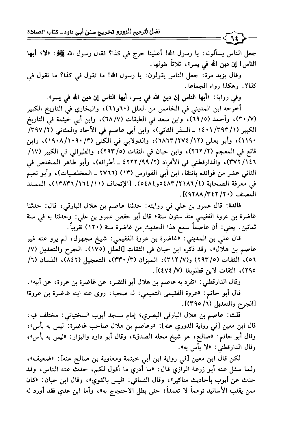 فائدة: قال عمرو بن علي في روايته: حدثنا عاصم بن هلال البارقي، قال: حدثنا غاضرة بن عروة الفقيمي منذ ستون سنة؛ قال أبو حفص عمرو بن علي: وحدثنا به في سنة ثمانين. يعني: أن عاصمًا سمع هذا الحديث من غاضرة سنة (١٢٠) تقريبًا.