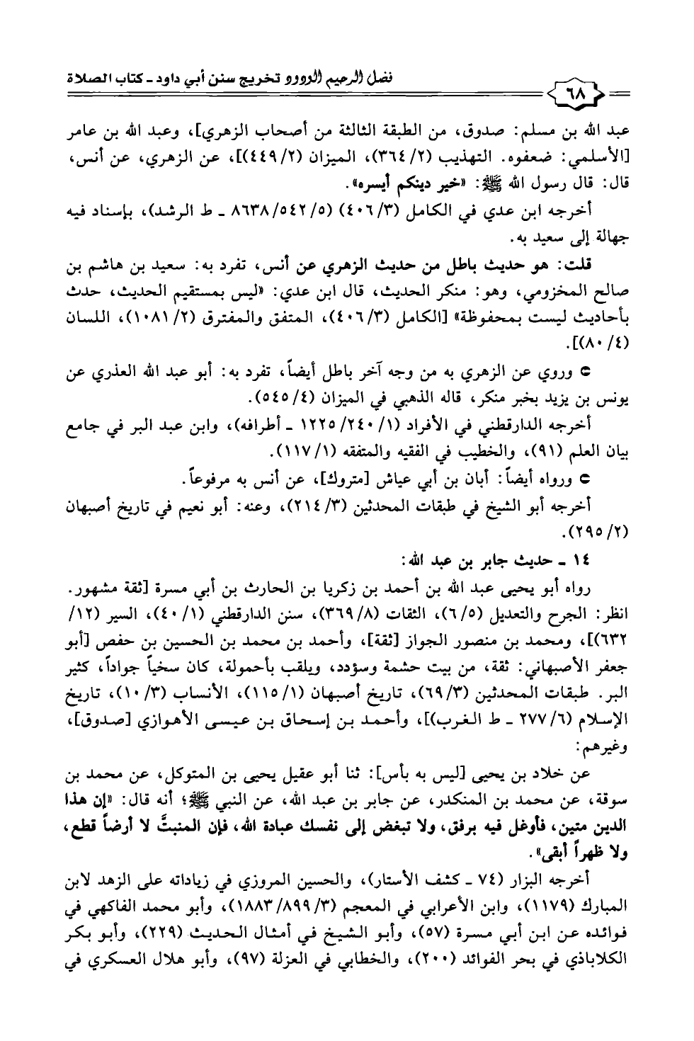 عن خلاد بن يحيى [ليس به بأس]: ثنا أبو عقيل يحيى بن المتوكل، عن محمد بن سوقة، عن محمد بن المنكدر، عن جابر بن عبد الله، عن النبي -صلى الله عليه وسلم-؛ أنه قال: "إن هذا الدين متين، فأوغل فيه برفق، ولا تبغض إلى نفسك عبادة الله، فإن المنبتَّ لا أرضًا قطع، ولا ظهرًا أبقى".