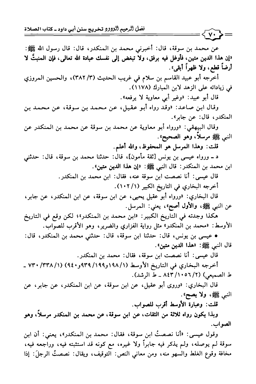د- ورواه عيسى بن يونس [ثقة مأمون]، قال: حدثنا محمد بن سوقة، قال: حدثني ابن محمد بن المنكدر: قال النبي -صلى الله عليه وسلم-: "إن هذا الدين متين".