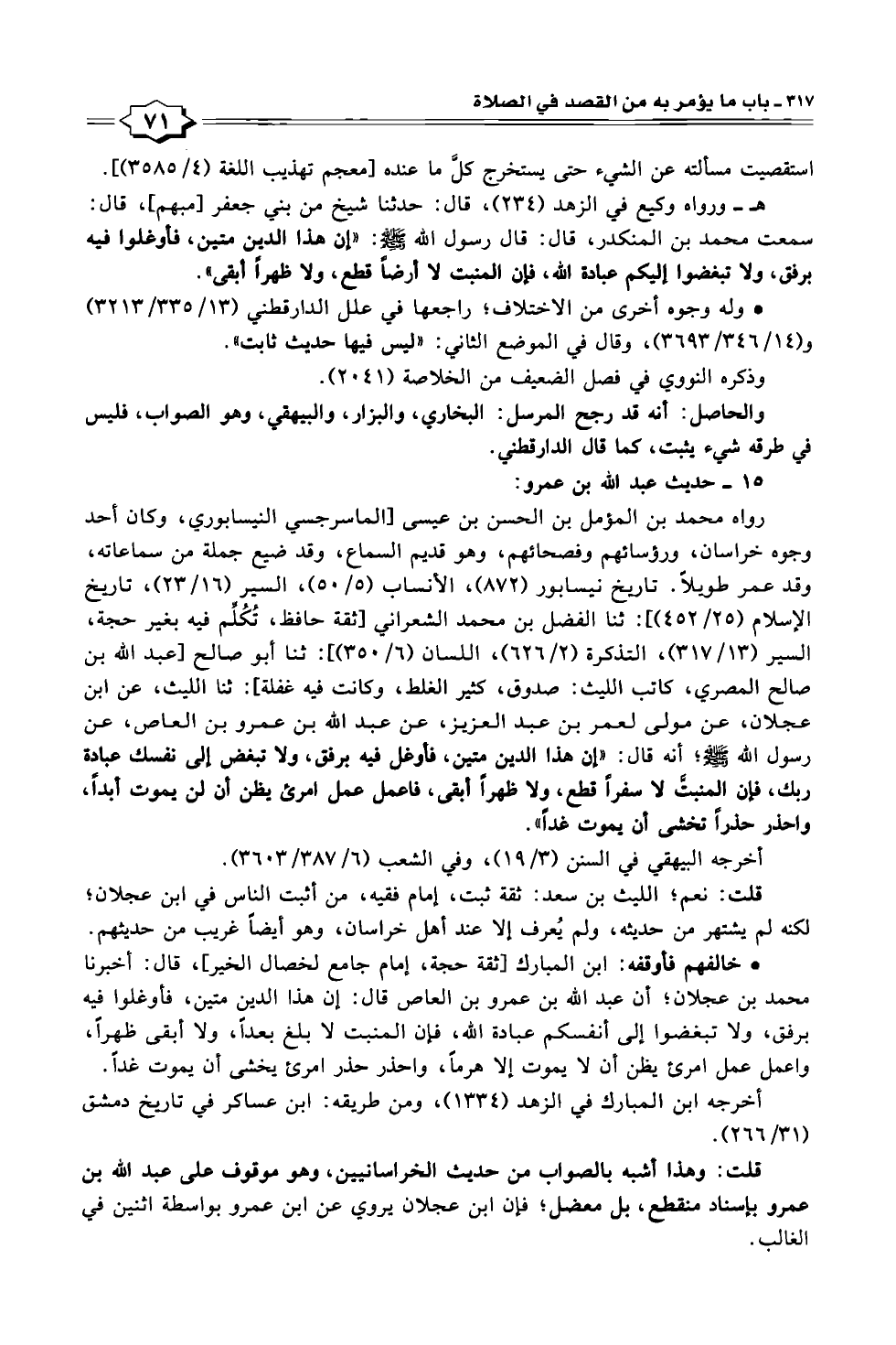 * خالفهم فأوقفه: ابن المبارك [ثقة حجة، إمام جامع لخصال الخير]، قال: أخبرنا محمد بن عجلان؛ أن عبد الله بن عمرو بن العاص قال: إن هذا الدين متين، فأوغلوا فيه برفق، ولا تبغضوا إلى أنفسكم عبادة الله، فإن المنبت لا بلغ بعدًا، ولا أبقى ظهرًا، واعمل عمل امرئ يظن أن لا يموت إلا هرمًا، واحذر حذر امرئ يخشى أن يموت غدًا. أخرجه ابن المبارك في الزهد (١٣٣٤)، ومن طريقه: ابن عساكر في تاريخ دمشق (٣١/ ٢٦٦).