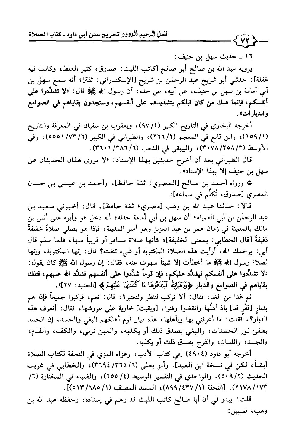 يرويه عبد الله بن صالح أبو صالح [كاتب الليث: صدوق، كثير الغلط، وكانت فيه غفلة]: حدثني أبو شريح عبد الرحمن بن شريح [الإسكندراني: ثقة]؛ أنه سمع سهل بن أبي أمامة بن سهل بن حنيف، عن أبيه، عن جده: أن رسول الله -صلى الله عليه وسلم- قال: "لا تشدِّدوا على أنفسكم، فإنما هلك من كان قبلكم بتشديدهم على أنفسهم، وستجدون بقاياهم في الصوامع والديارات".