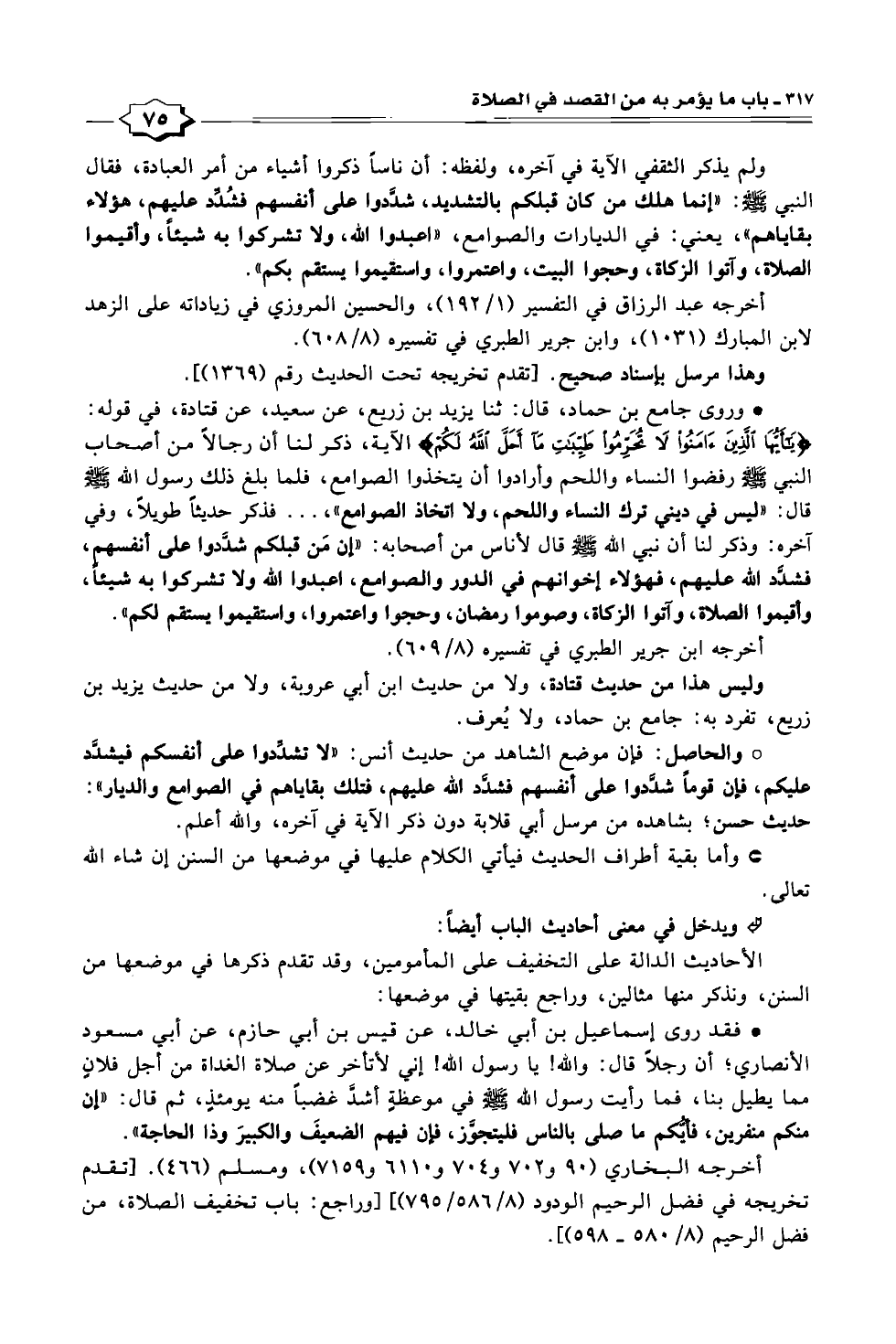 ولم يذكر الثقفي الآية في آخره، ولفظه: أن ناسًا ذكروا أشياء من أمر العبادة، فقال النبي -صلى الله عليه وسلم-: "إنما هلك من كان قبلكم بالتشديد، شدَّدوا على أنفسهم فشُدِّد عليهم، هؤلاء بقاياهم"، يعني: في الديارات والصوامع، "اعبدوا الله، ولا تشركوا به شيئًا، وأقيموا الصلاة، وآتوا الزكاة، وحجوا البيت، واعتمروا، واستقيموا يستقم بكم".