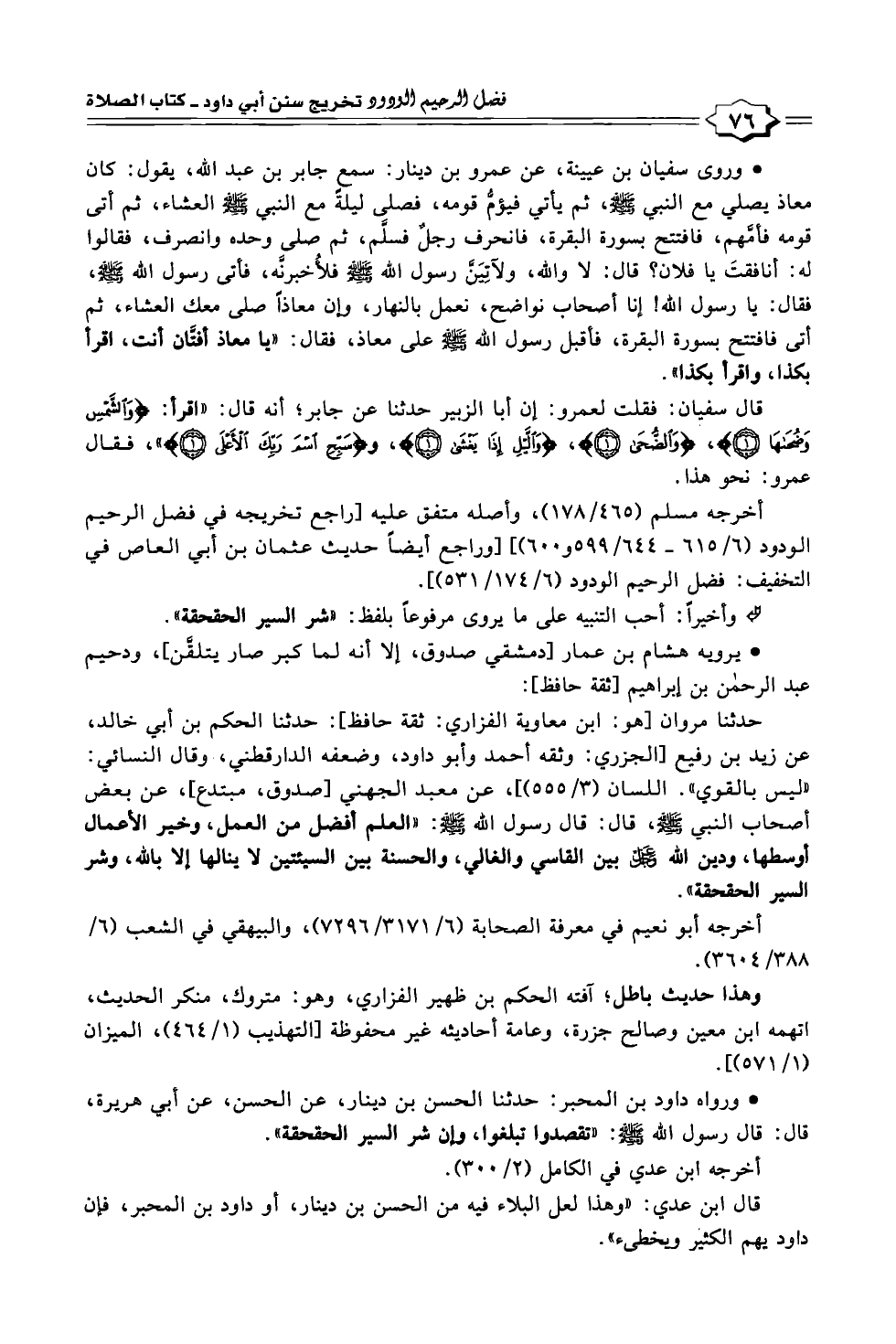 * وروى سفيان بن عيينة، عن عمرو بن دينار: سمع جابر بن عبد الله، يقول: كان معاذ يصلي مع النبي -صلى الله عليه وسلم-، ثم يأتي فيؤمُّ قومه، فصلى ليلةً مع النبي -صلى الله عليه وسلم- العشاء، ثم أتى قومه فأمَّهم، فافتتح بسورة البقرة، فانحرف رجلٌ فسلَّم، ثم صلى وحده وانصرف، فقالوا له: أنافقتَ يا فلان؟ قال: لا والله، ولآتِيَنَّ رسول الله -صلى الله عليه وسلم- فلأُخبرنَّه، فأتى رسول الله -صلى الله عليه وسلم-، فقال: يا رسول الله! إنا أصحاب نواضح، نعمل بالنهار، وإن معاذًا صلى معك العشاء، ثم أتى فافتتح بسورة البقرة، فأقبل رسول الله -صلى الله عليه وسلم- على معاذ، فقال: "يا معاذ أفتَّان أنت، اقرأ بكذا، واقرأ بكذا".