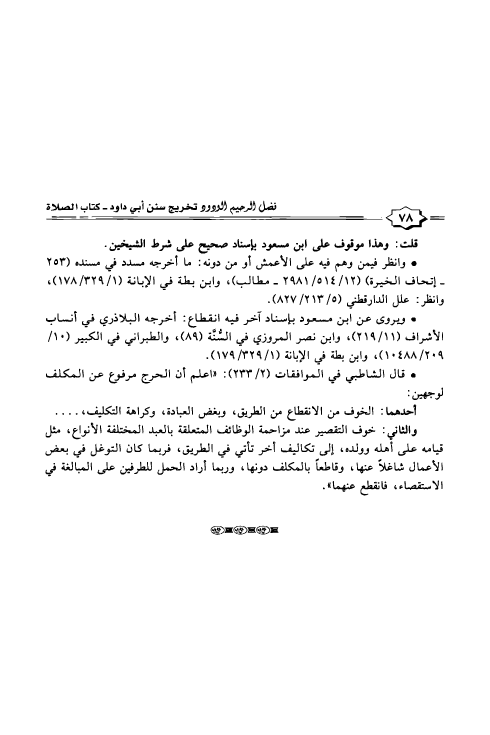 * قال الشاطبي في الموافقات (٢/ ٢٣٣): "اعلم أن الحرج مرفوع عن المكلف لوجهين: