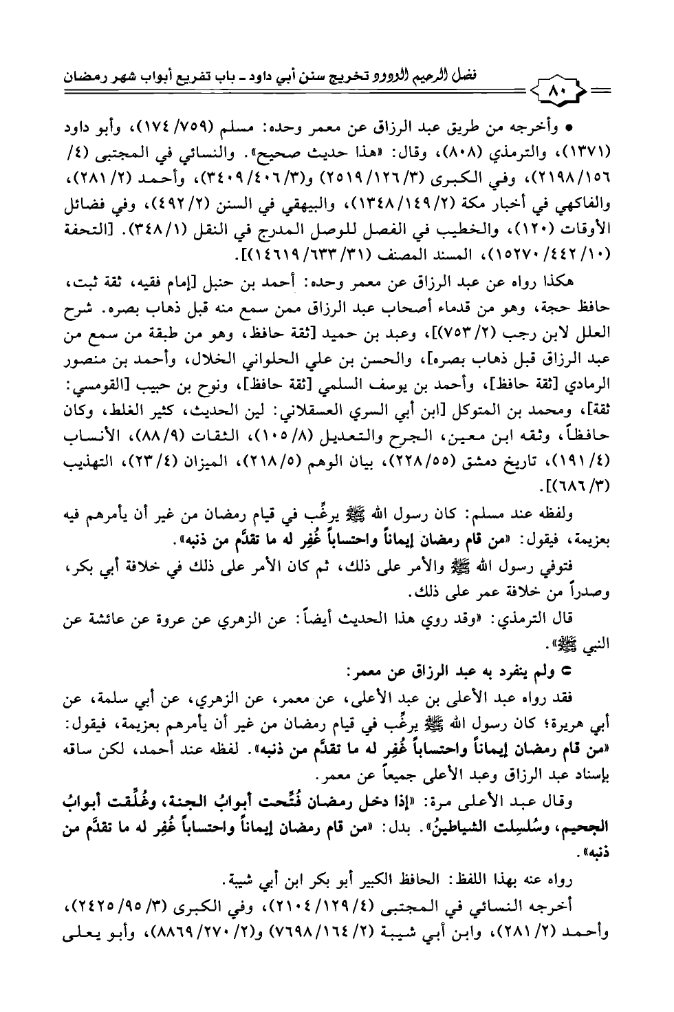 فقد رواه عبد الأعلى بن عبد الأعلى، عن معمر، عن الزهري، عن أبي سلمة، عن أبي هريرة؛ كان رسول الله -صلى الله عليه وسلم- يرغِّب في قيام رمضان من غير أن يأمرهم بعزيمة، فيقول: "من قام رمضان إيمانًا واحتسابًا غُفِر له ما تقدَّم من ذنبه". لفظه عند أحمد، لكن ساقه بإسناد عبد الرزاق وعبد الأعلى جميعًا عن معمر.