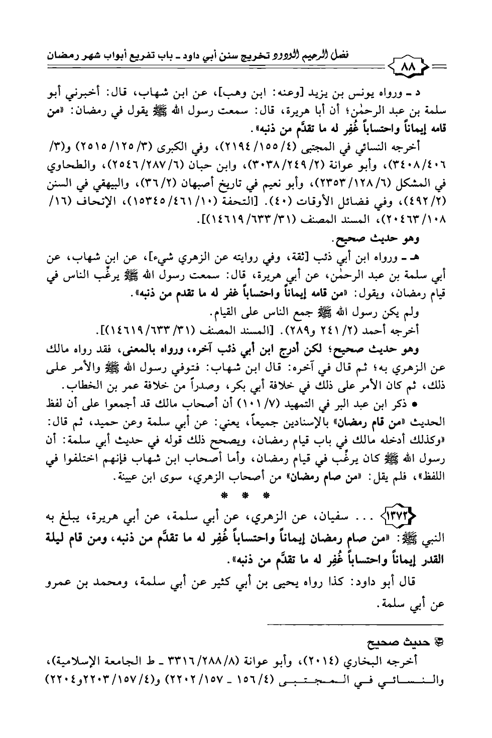 هـ- ورواه ابن أبي ذئب [ثقة، وفي روايته عن الزهري شيء]، عن ابن شهاب، عن أبي سلمة بن عبد الرحمن، عن أبي هريرة، قال: سمعت رسول الله -صلى الله عليه وسلم- يرغِّب الناس في قيام رمضان، ويقول: "من قامه إيمانًا واحتسابًا غفر له ما تقدم من ذنبه".