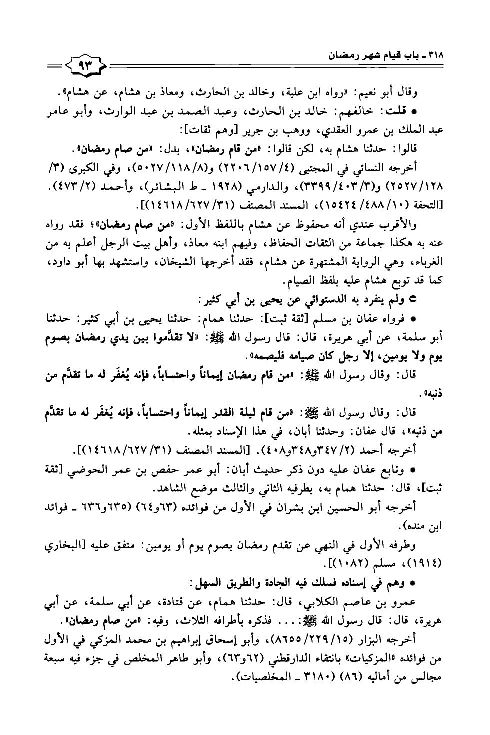 * فرواه عفان بن مسلم [ثقة ثبت]: حدثنا همام: حدثنا يحيى بن أبي كثير: حدثنا أبو سلمة، عن أبي هريرة، قال: قال رسول الله -صلى الله عليه وسلم-: "لا تقدَّموا بين يدي رمضان بصوم يوم ولا يومين، إلا رجل كان صيامه فليصمه".