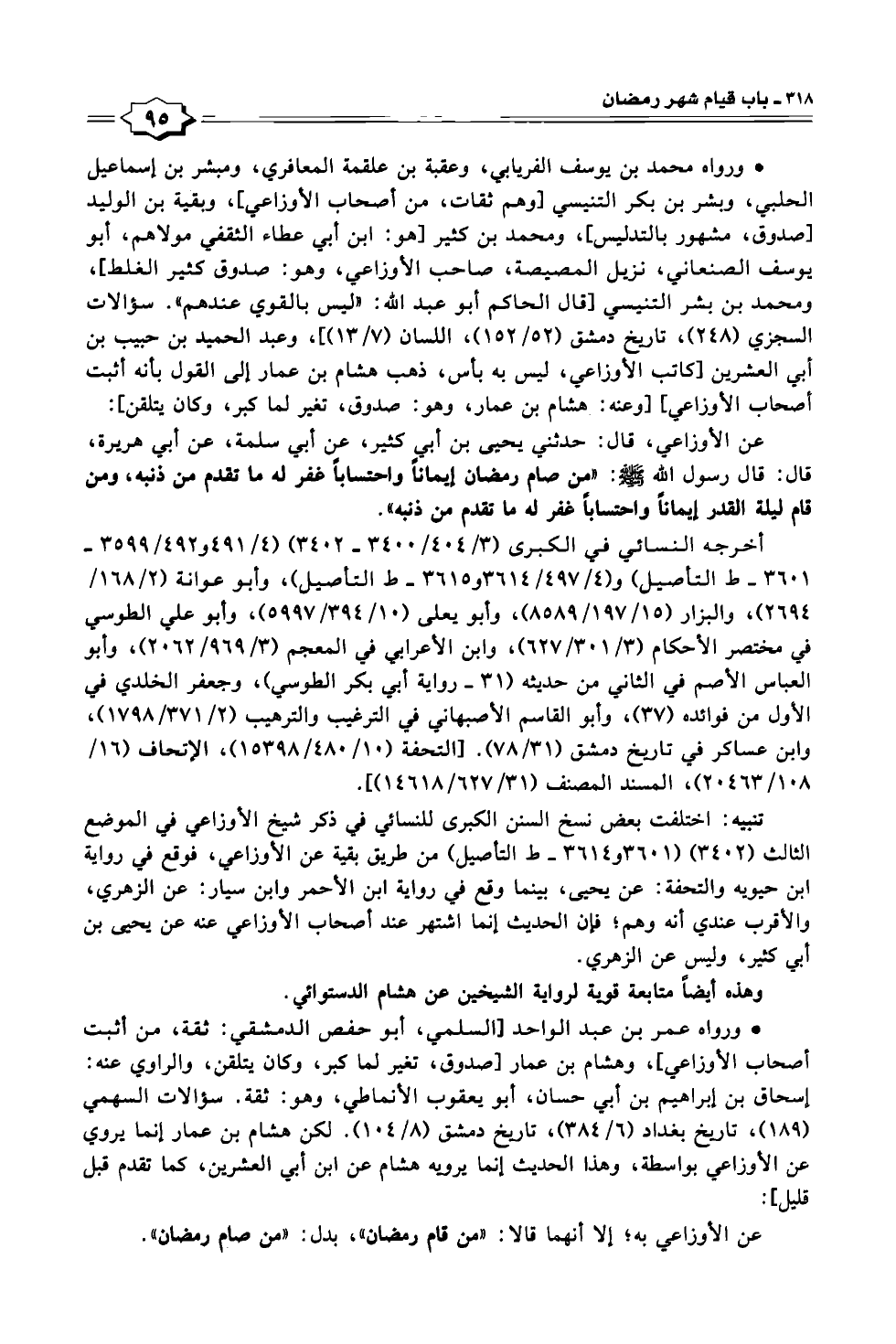 تنبيه: اختلفت بعض نسخ السنن الكبرى للنسائي في ذكر شيخ الأوزاعي في الموضع الثالث (٣٤٠٢) (٣٦٠١ و ٣٦١٤ - ط التأصيل) من طريق بقية عن الأوزاعي، فوقع في رواية ابن حيويه والتحفة: عن يحيى، بينما وقع في رواية ابن الأحمر وابن سيار: عن الزهري، والأقرب عندي أنه وهم؛ فإن الحديث إنما اشتهر عند أصحاب الأوزاعي عنه عن يحيى بن أبي كثير، وليس عن الزهري.