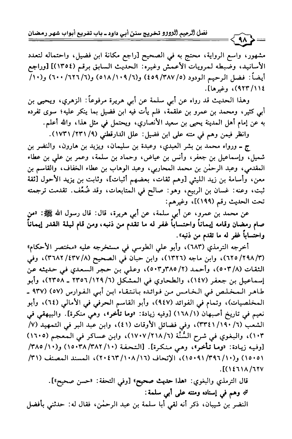 وهذا الحديث قد رواه عن أبي سلمة عن أبي هريرة مرفوعاً: الزهري، ويحيى بن أبي كثير، ومحمد بن عمرو بن علقمة، فلم يأت فيه ابن فضيل بما ينكر عليه؛ سوى تفرده به عن إمام أهل المدينة يحيى بن سعيد الأنصاري، ويحتمل في مثل هذا، والله أعلم.