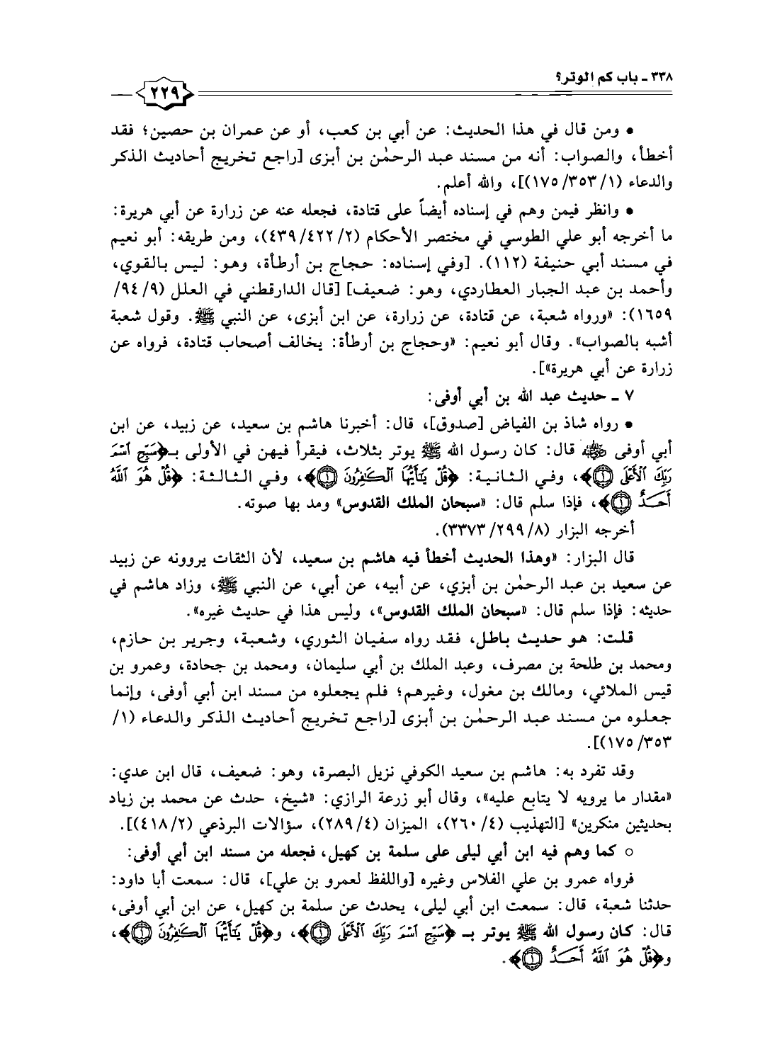 قال البزار: "وهذا الحديث أخطأ فيه هاشم بن سعيد، لأن الثقات يروونه عن زبيد عن سعيد بن عبد الرحمن بن أبزي، عن أبيه، عن أبي، عن النبي - صلى الله عليه وسلم -، وزاد هاشم في حديثه: فإذا سلم قال: "سبحان الملك القدوس"، وليس هذا في حديث غيره".